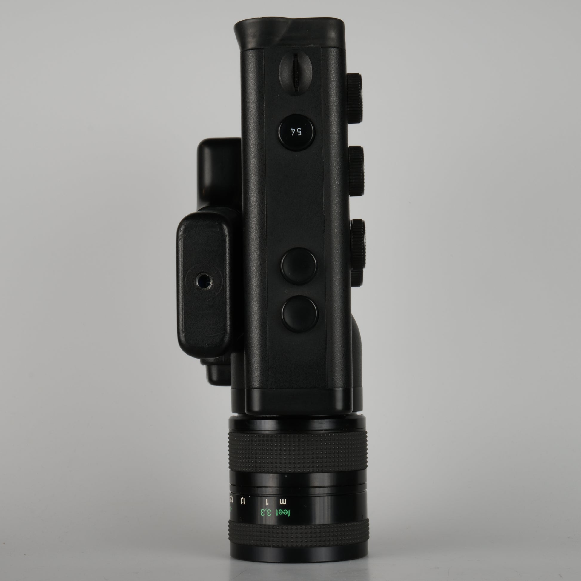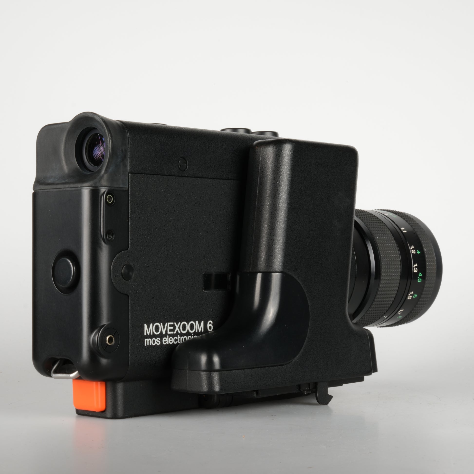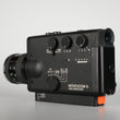 Agfa Super 8 film camera with electric film transport. Supports 9, 18, 24, and 54 frames per second, as well as single-frame mode. Automatic and manual exposure metering (TTL CdS), background control, filter contact, and remote control/cable release connection. Interval timer for time-lapse photography, fade-in/out, and lap dissolve functions.