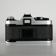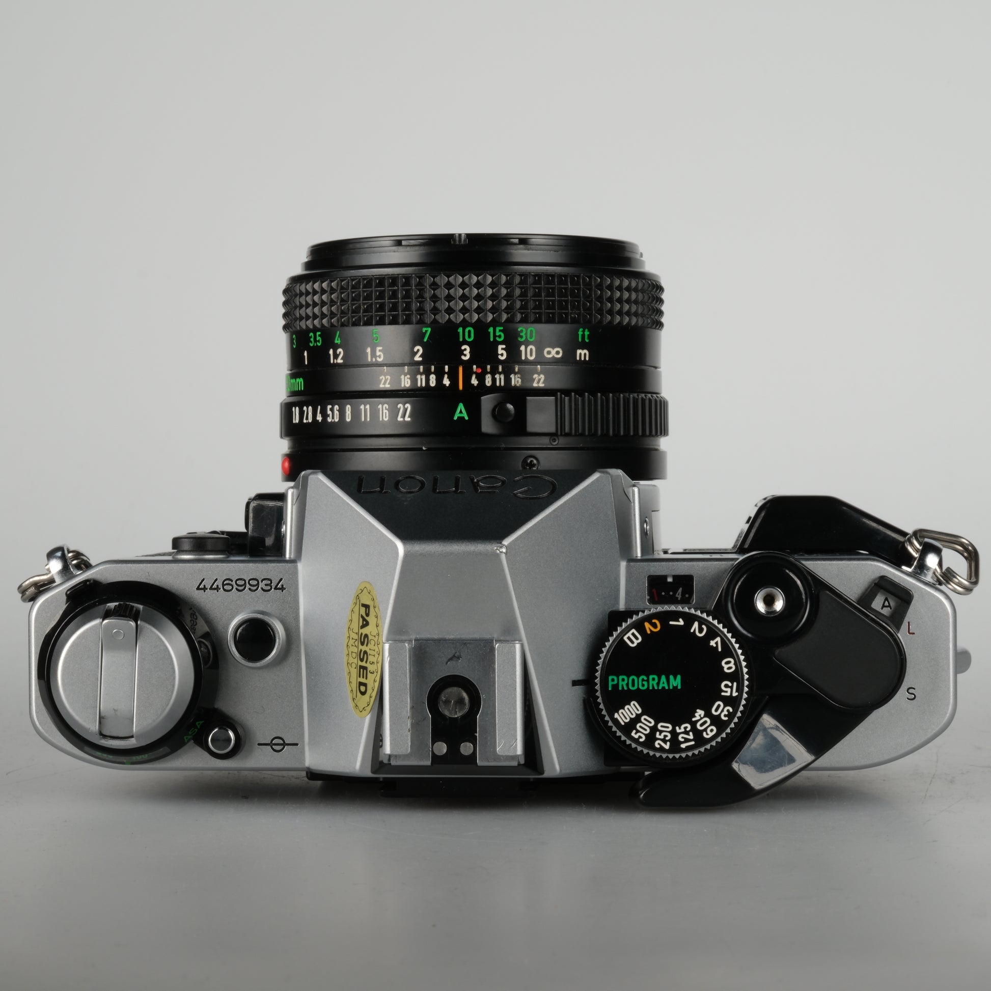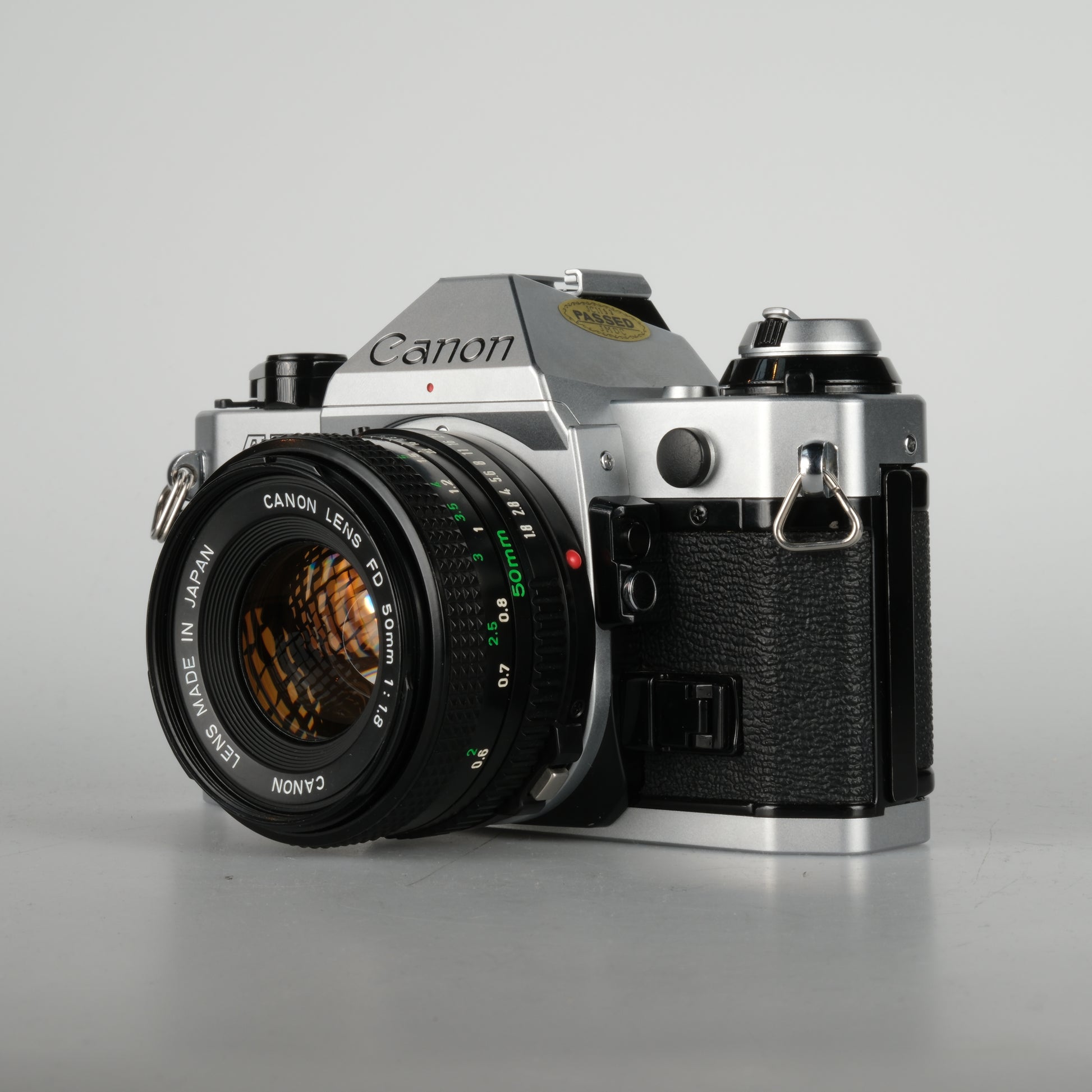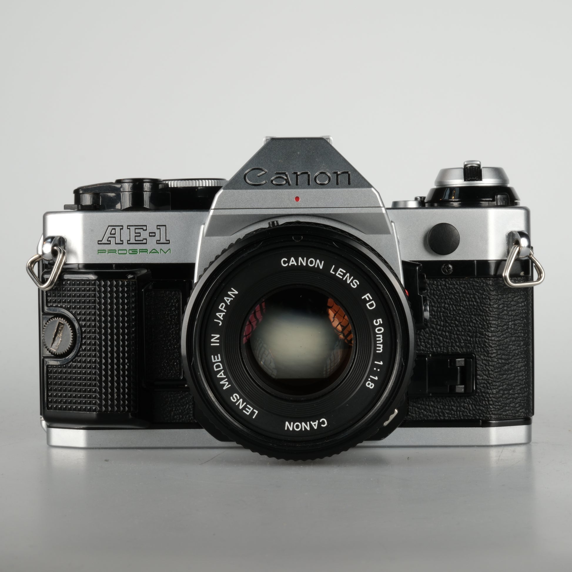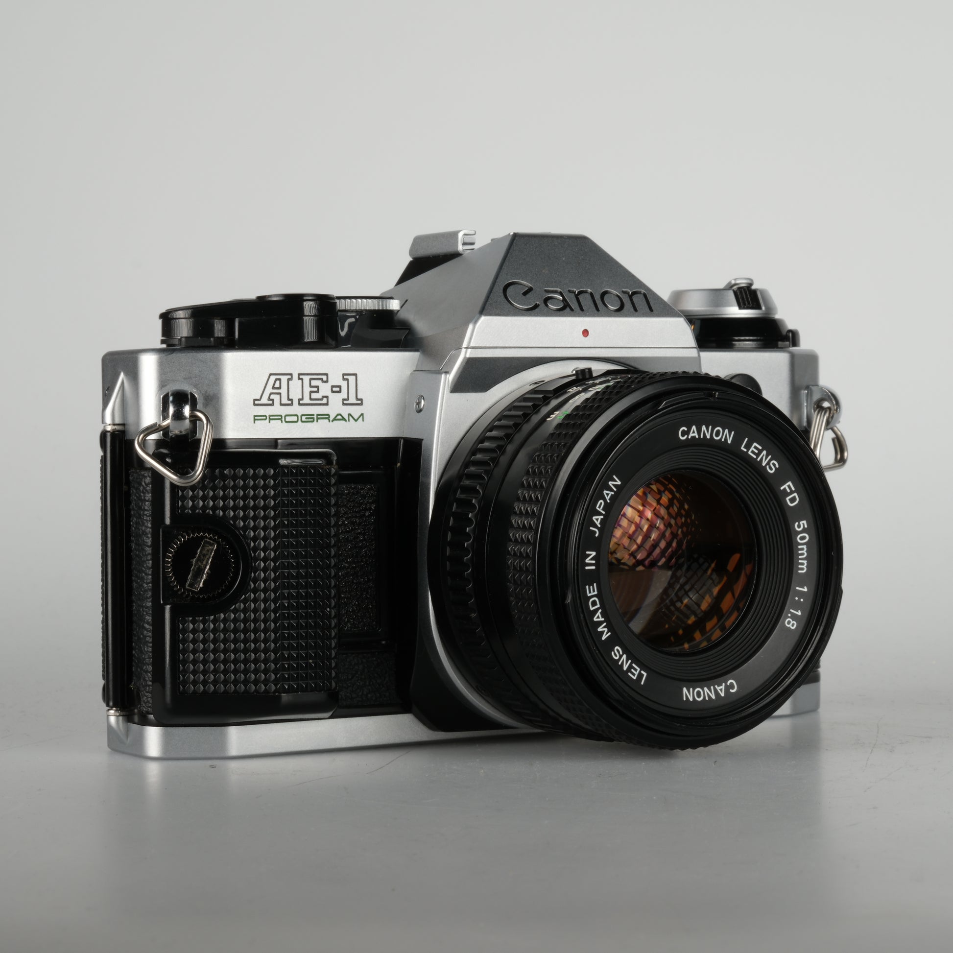 Canon AE-1 35mm SLR camera with program, aperture-priority, shutter-priority, and manual exposure modes. Shutter speeds: 2 sec. – 1/1000 sec. + B. ISO adjustable via built-in light meter 12-3200. Exposure metering: TTL silver cell. Compatible with Canon FD lenses.