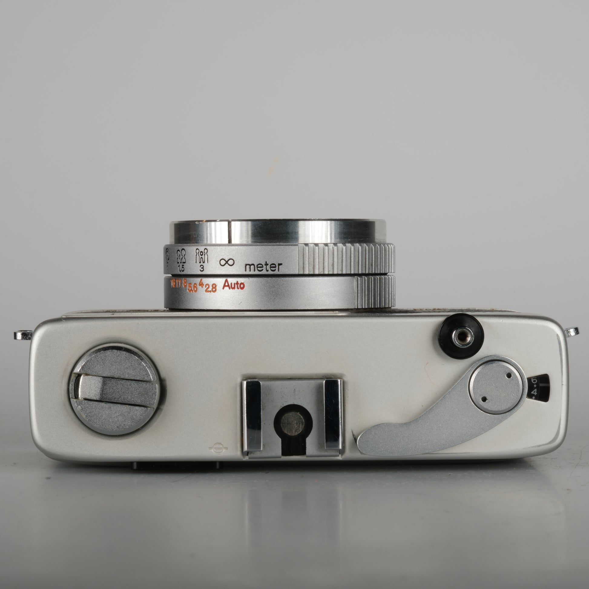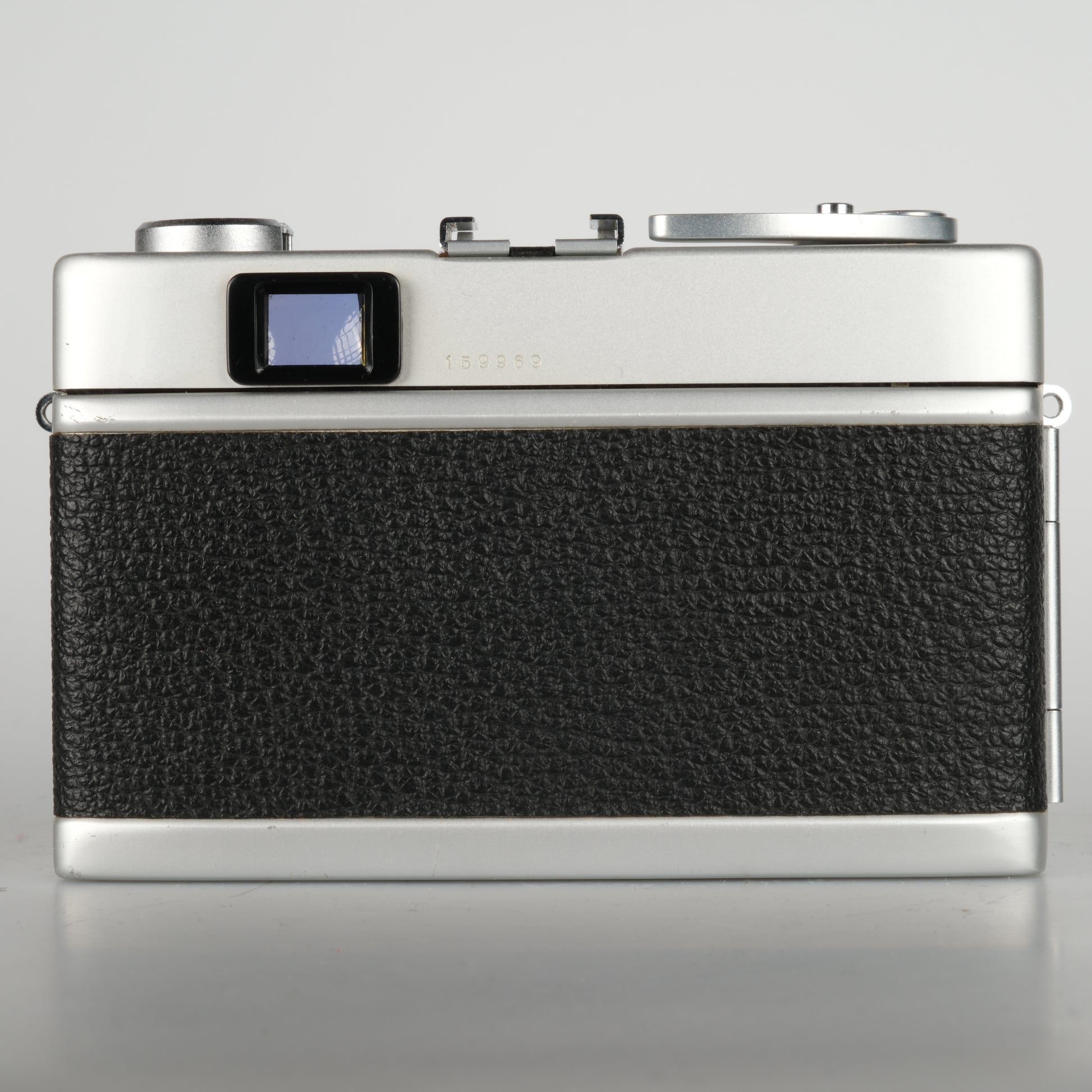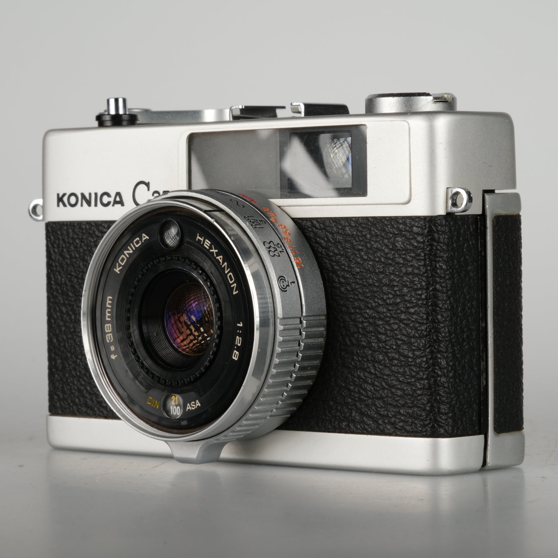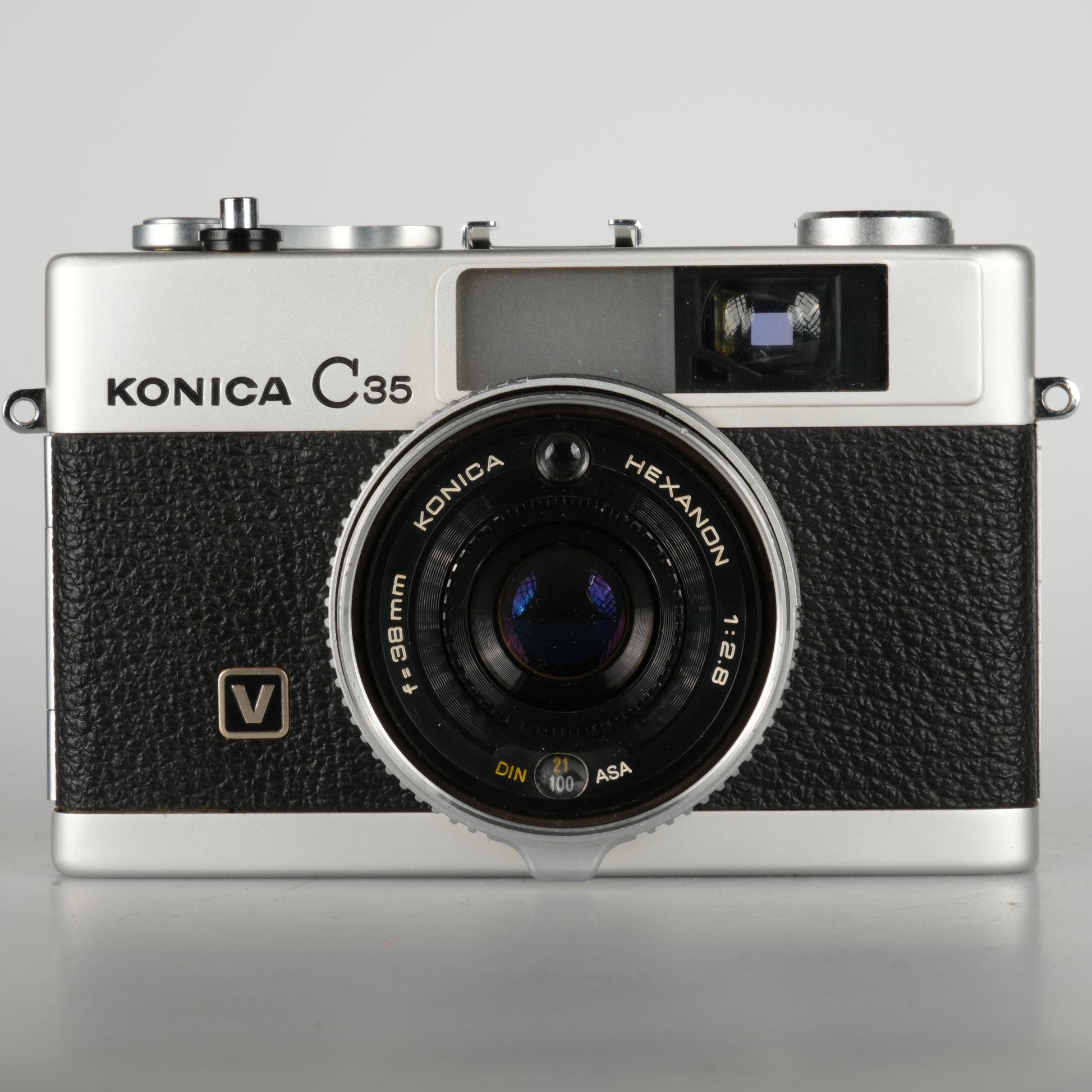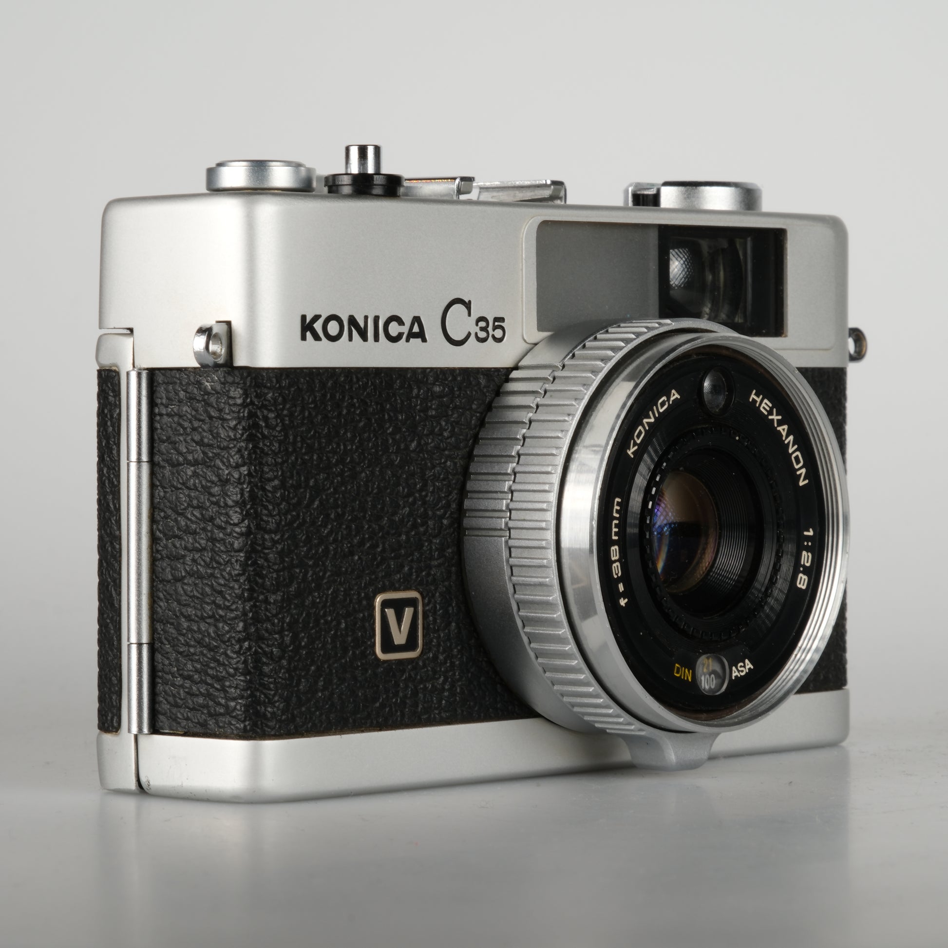 Konica C35 35mm rangefinder camera with aperture-priority automatic exposure. Shutter speeds: 1/30 sec. – 1/650 sec. (automatic). ISO adjustable via the built-in light meter (film dependent). Exposure metering: CdS meter, works optimally with film sensitivities from ISO 25 to ISO 400. Fixed lens with manual focus.