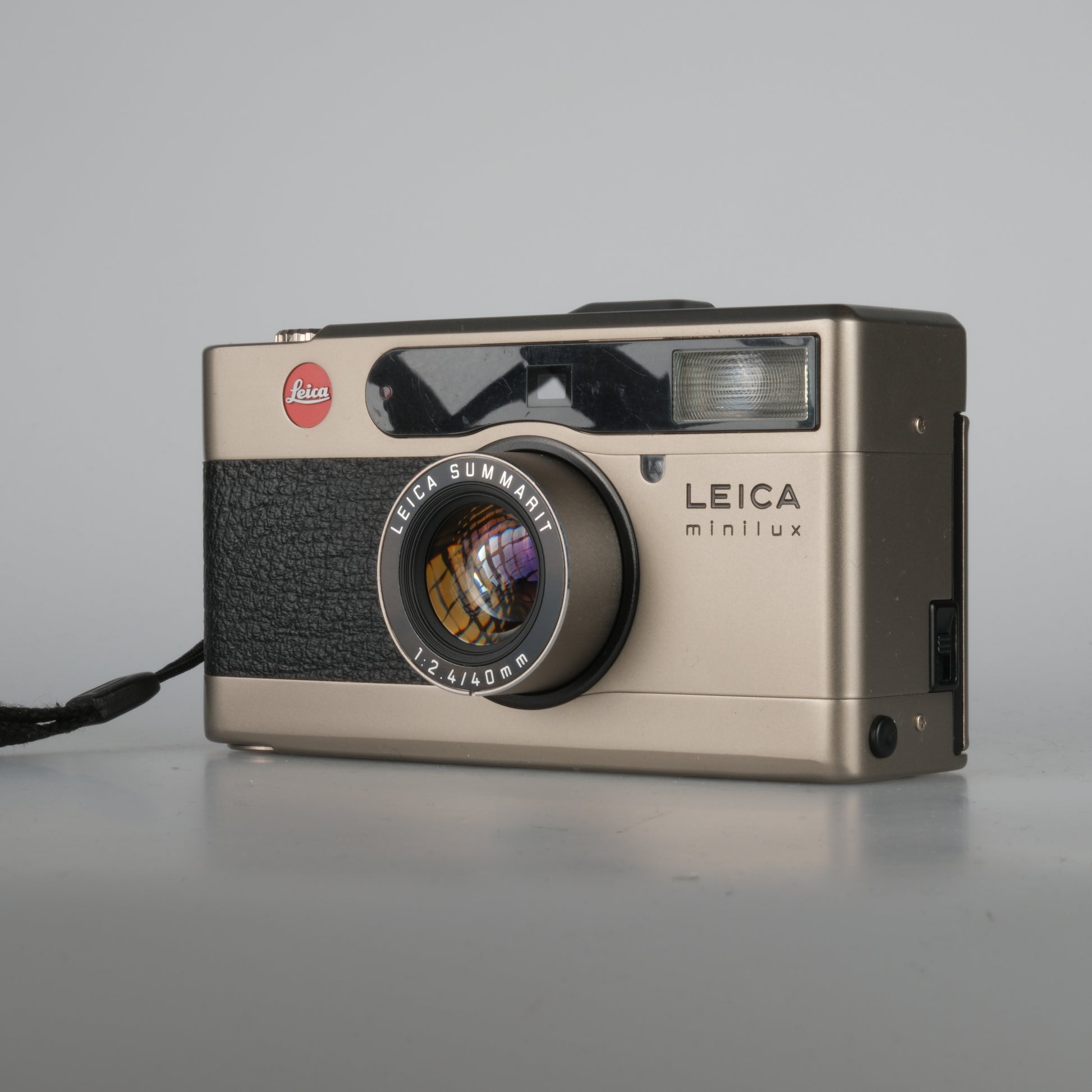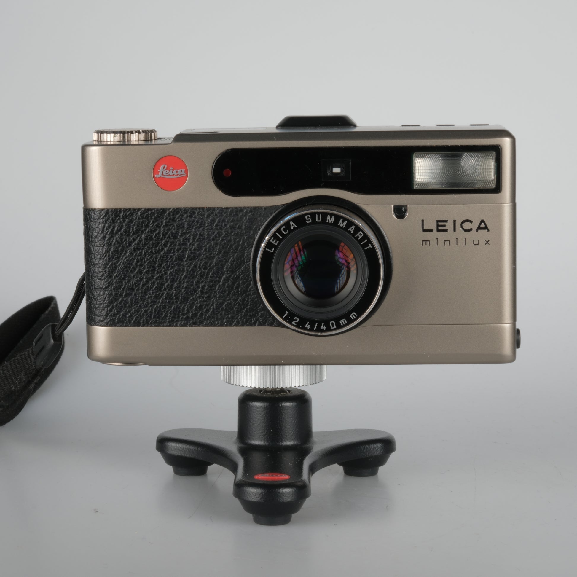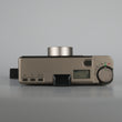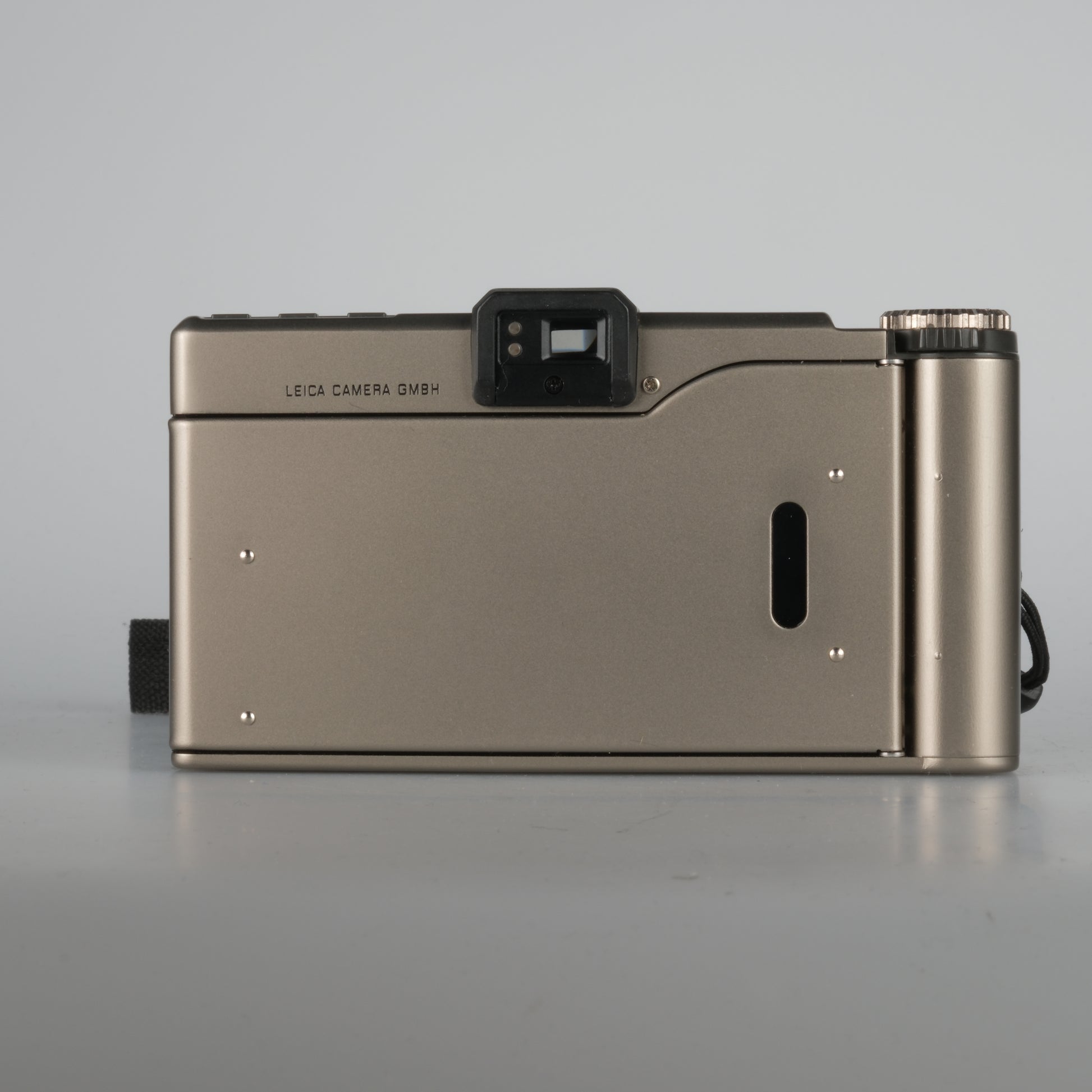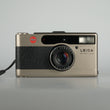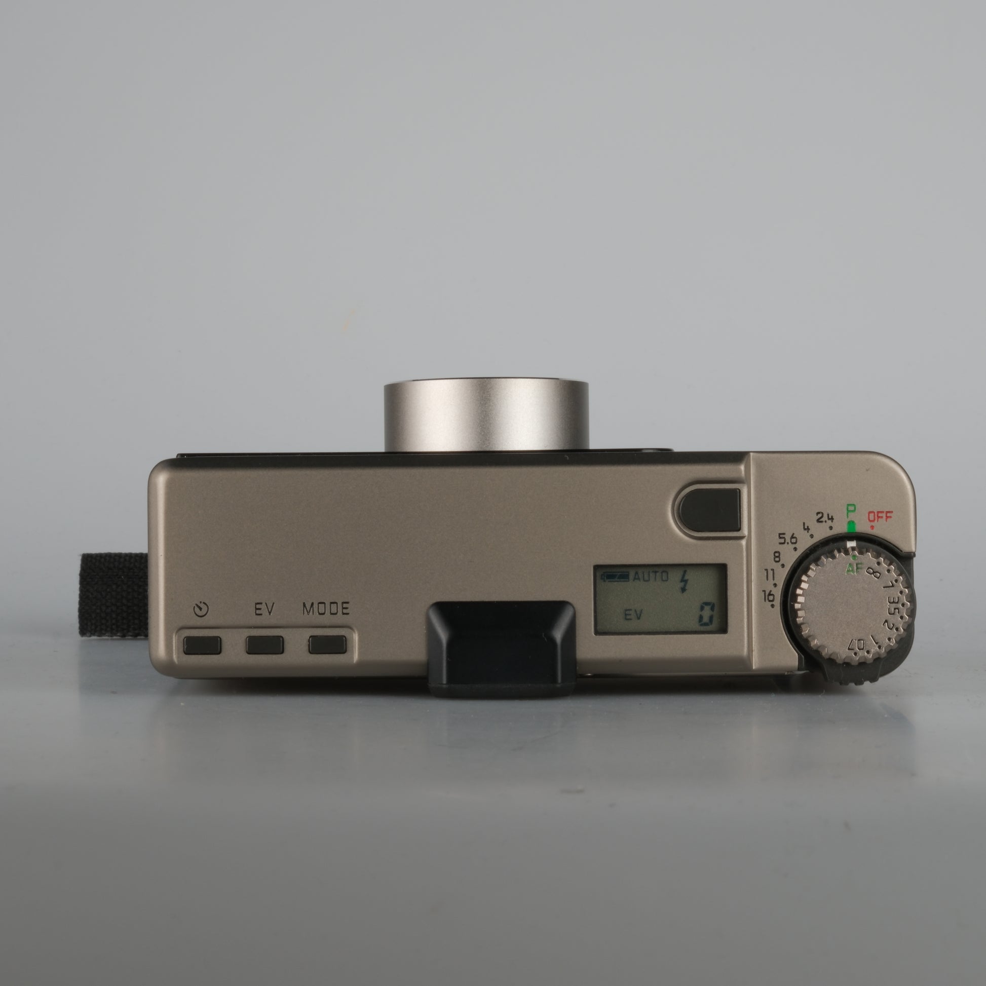 "Premium viewfinder camera" with a high-quality, six-element lens, switchable autofocus, program or aperture priority with manually selectable apertures. Titanium body caps.