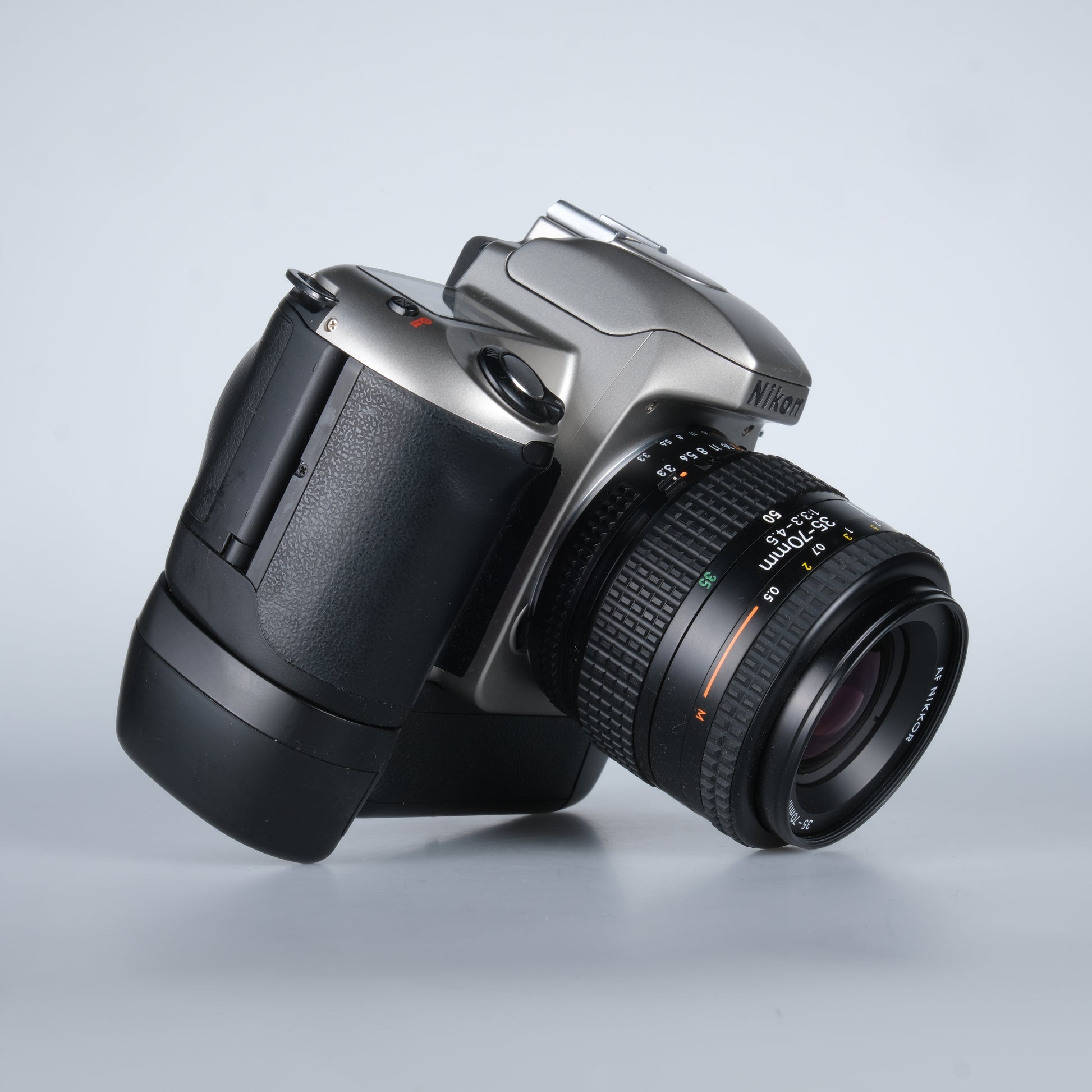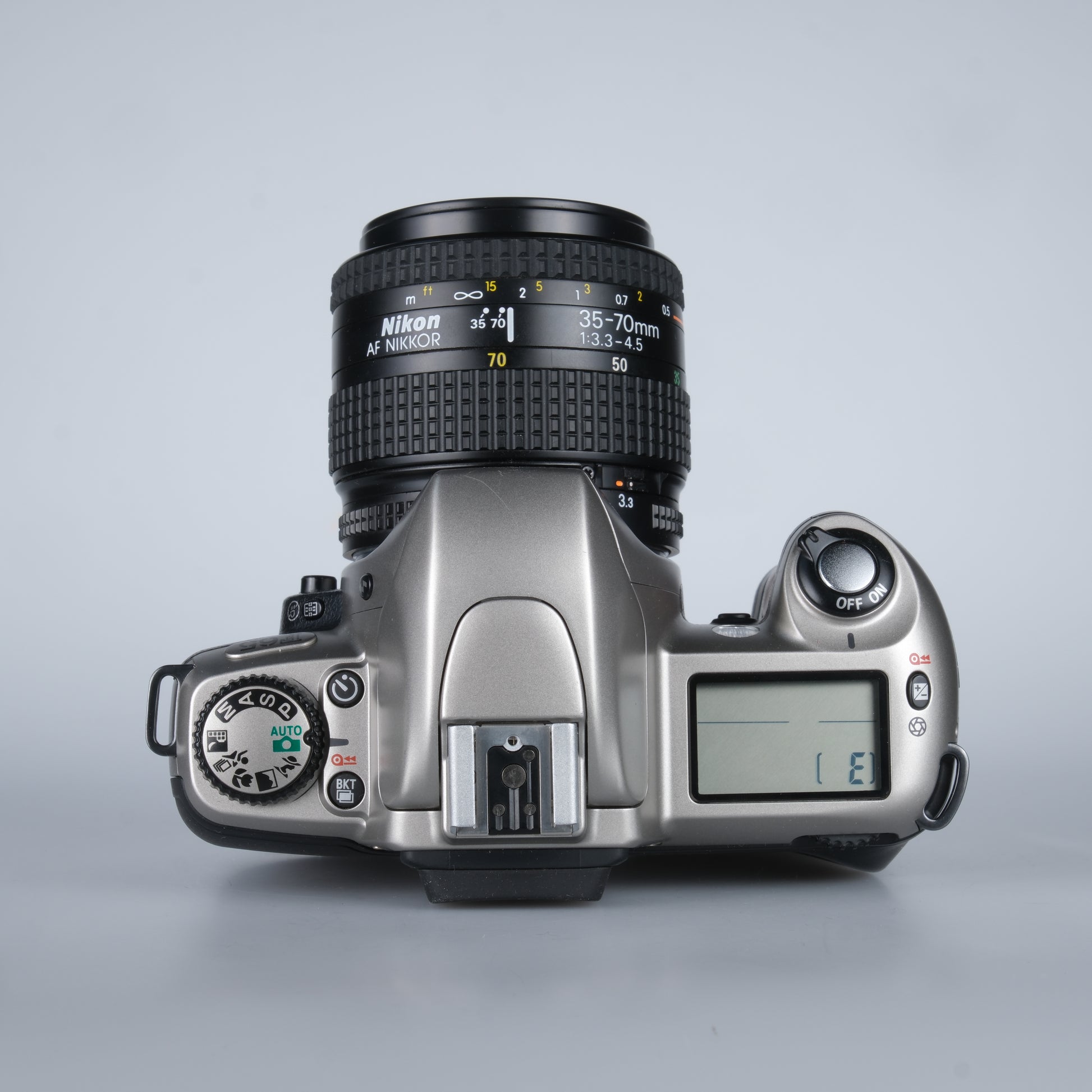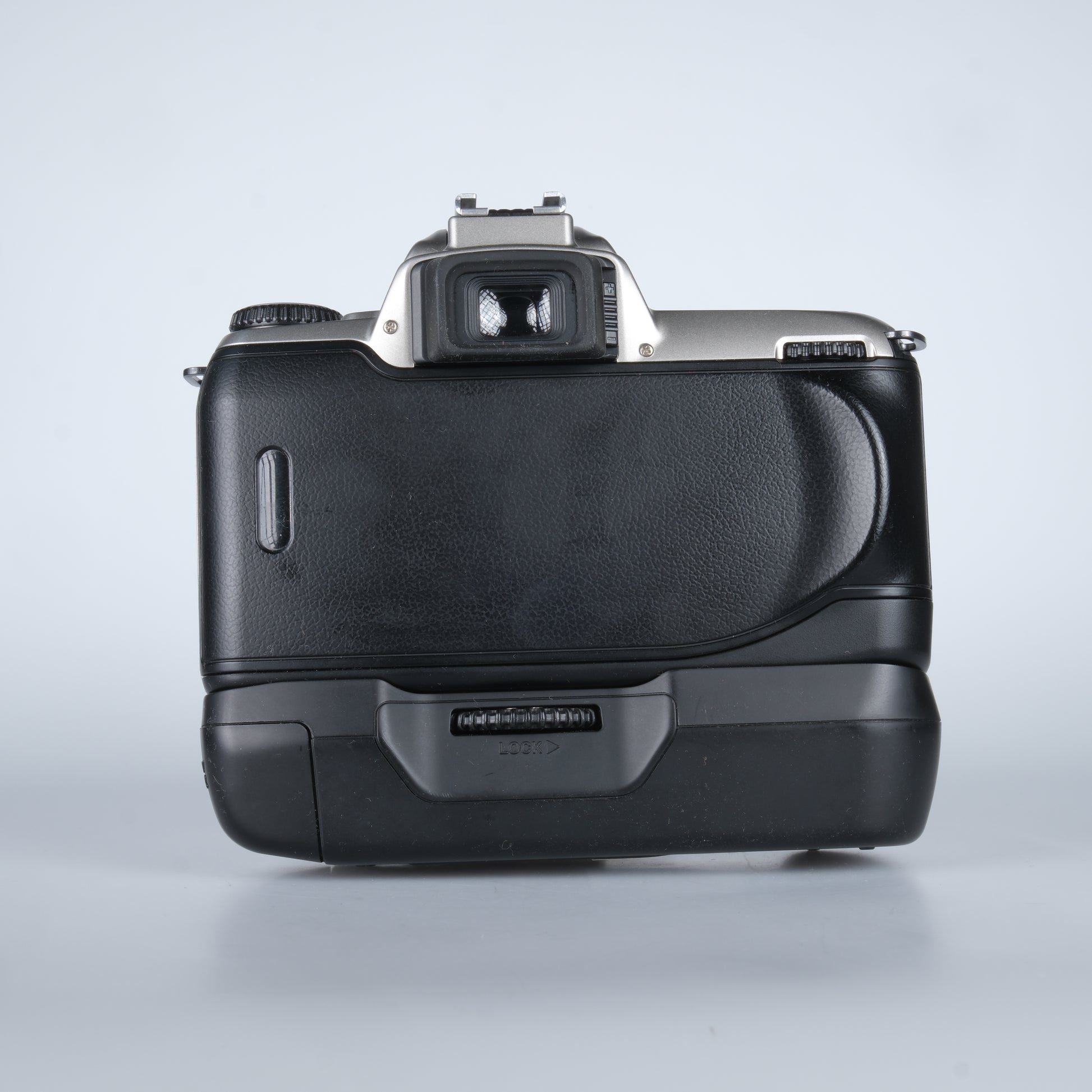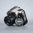 Sehr moderne Spiegelreflexkamera mit Stangenautofokus, eingebautem Blitz, verschiedenen Szenenprogrammen und Automatiken, so wie einem voll manuellen Modus.