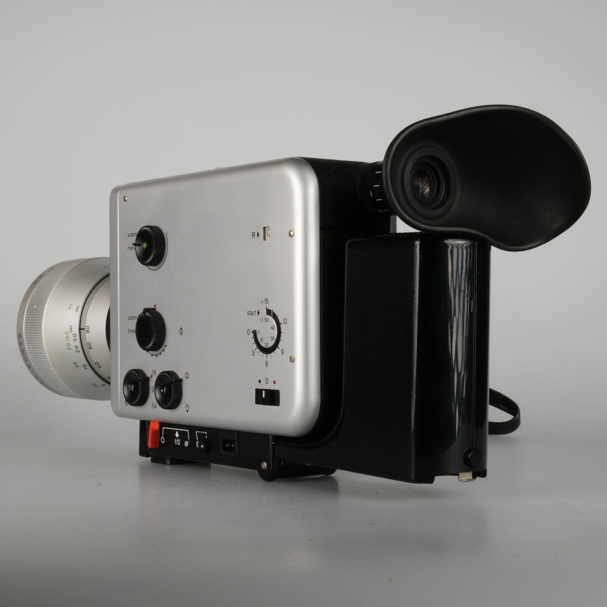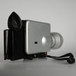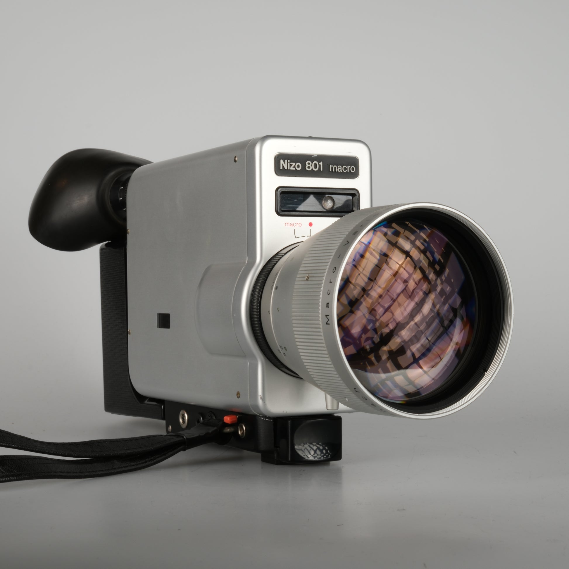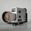 Nizo Super 8 film camera. Equipped with a macro zoom lens, electronic exposure control (auto & manual), and precise electric film transport. Supports 18 and 24 fps as well as 54 fps and single-frame mode.