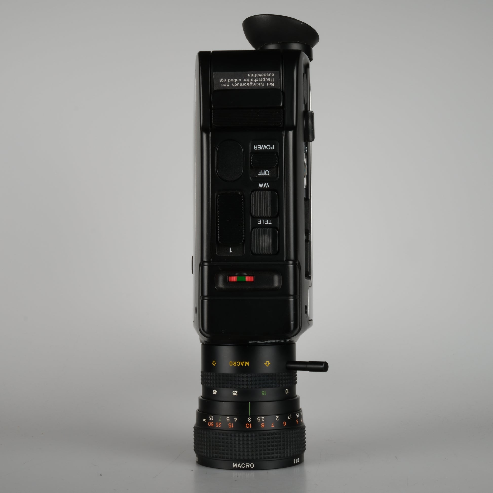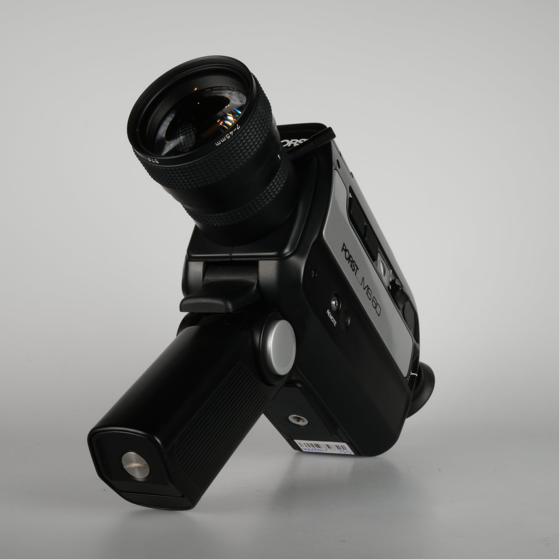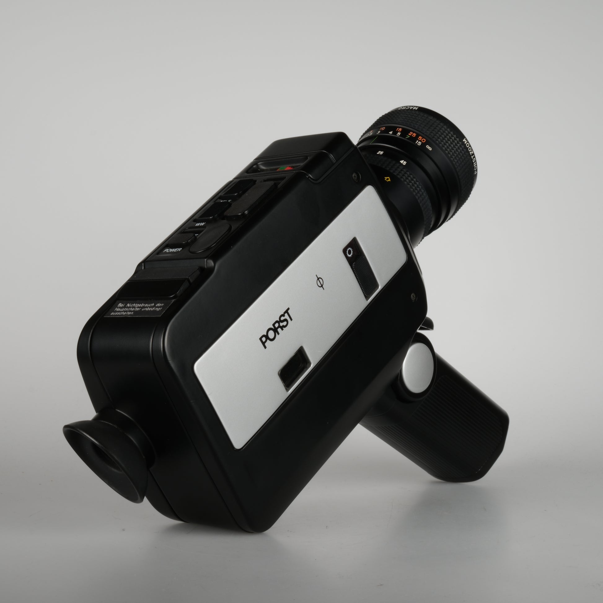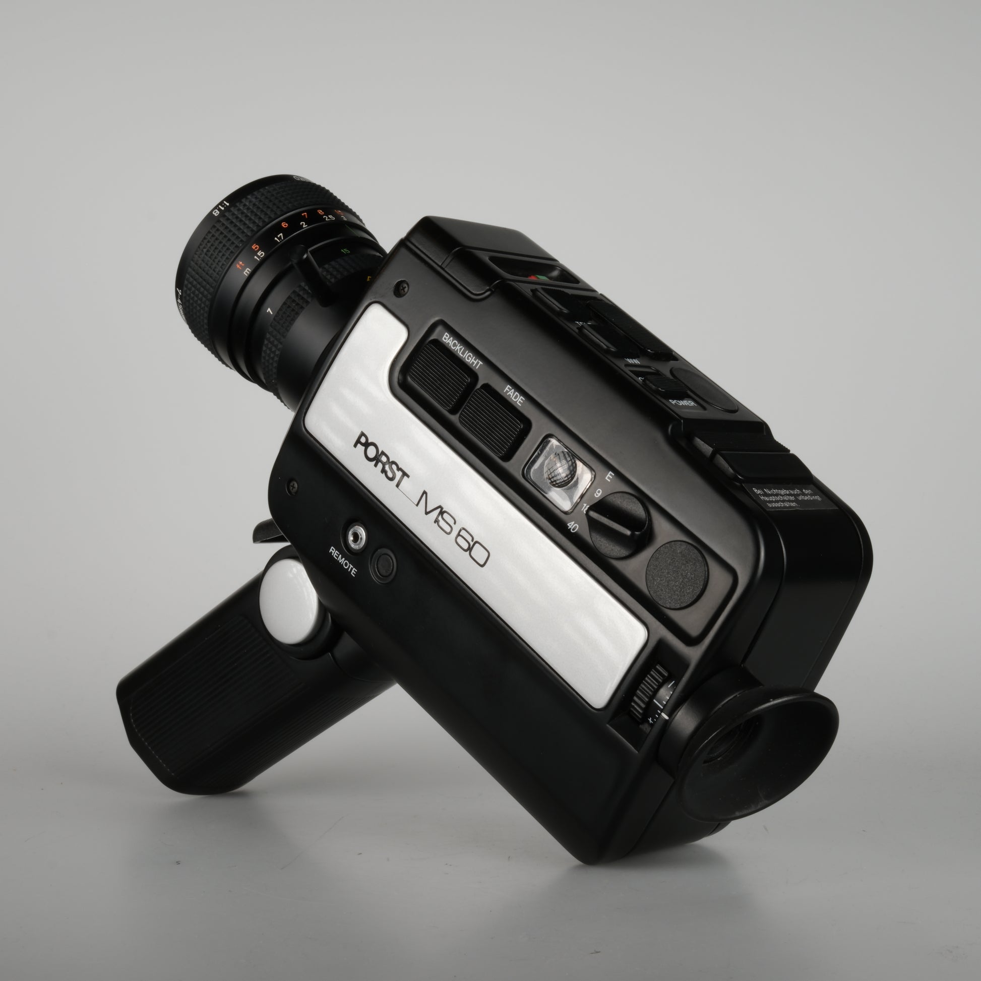 Porst MS 60 Super 8 film camera. Equipped with a reflex viewfinder, TTL automatic exposure, and manual settings. Supports 9, 18, and 40 fps as well as single-frame shooting.