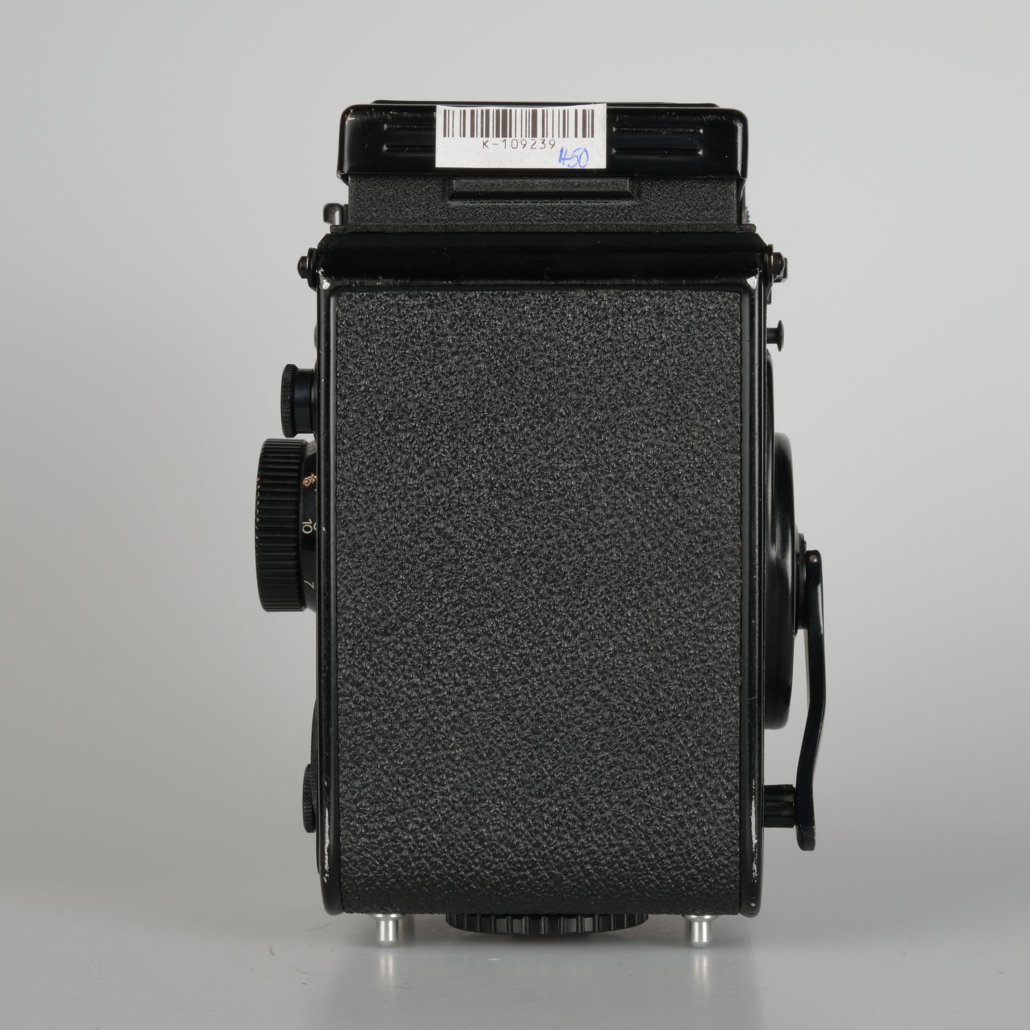 Twin-lens reflex camera for 6x6 negative format. Integrated exposure meter ISO 25-400, shutter speeds 1 sec. - 1/500 sec. + B.