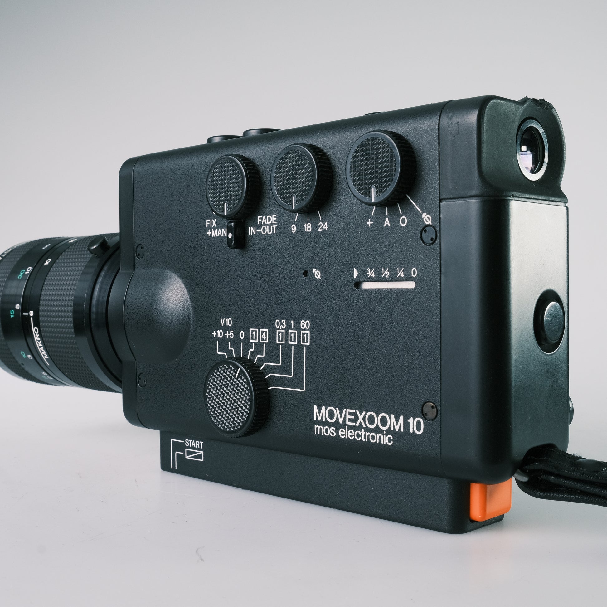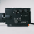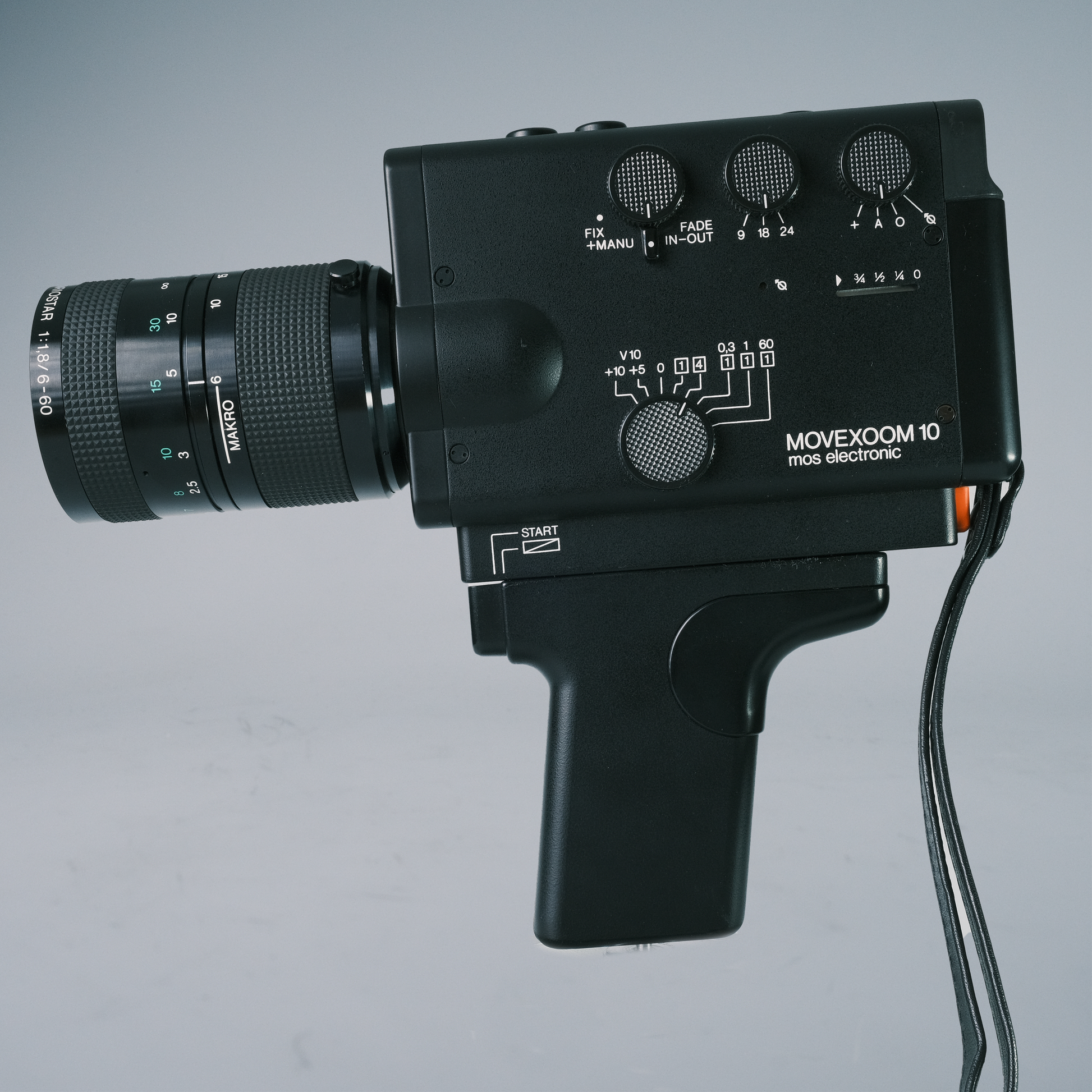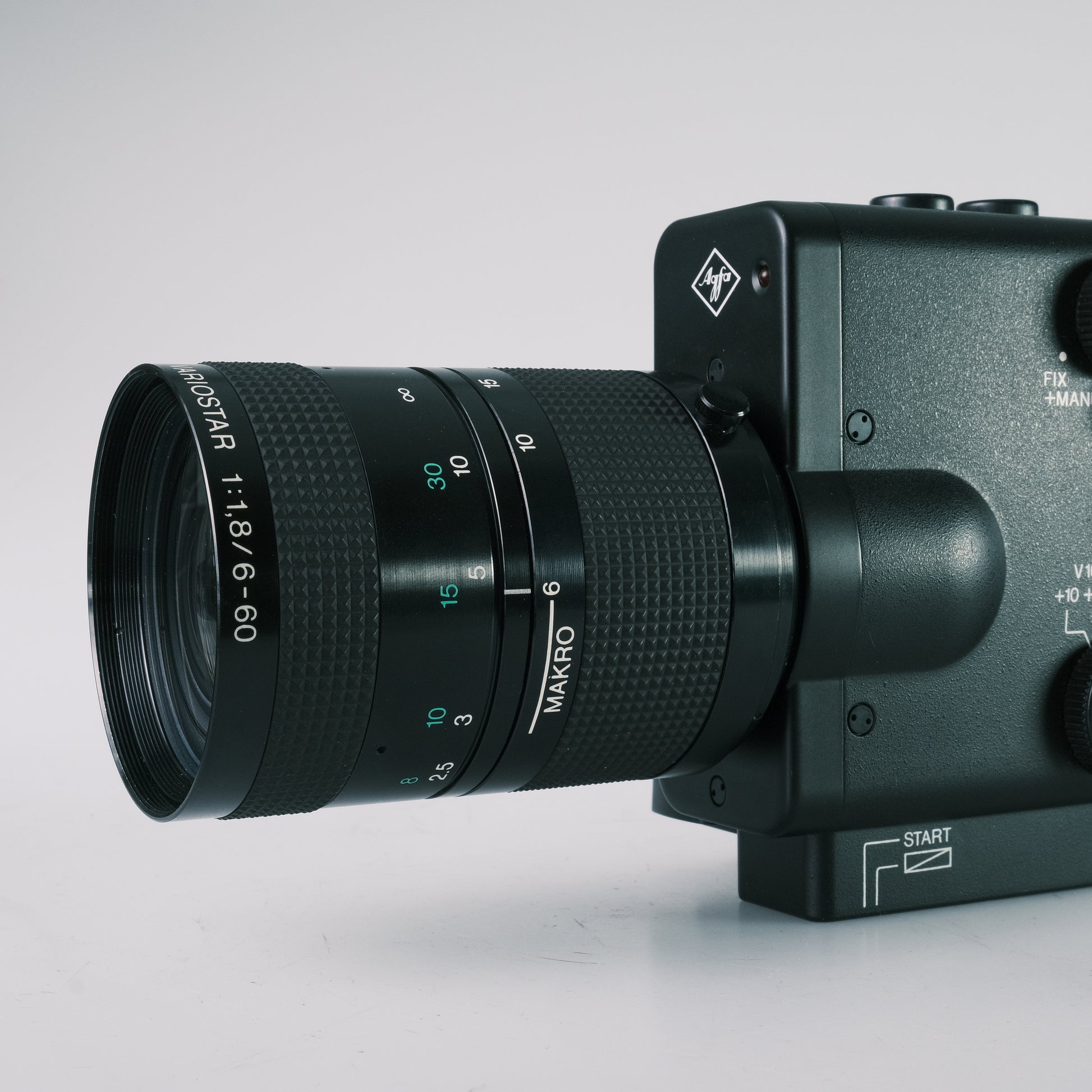 Späte, durch Digitalbaustein gesteuerte Super 8 Kamera. 1, 9, 18, 24 und 54 Bilder pro Sekunde. Timer-Funktion für Einzelbildtricks, manuelle und automatische Belichtungsmessung. Auf-, Ab- und Überblendungen. Mit Macro-Objektiv. Für Super 8 starkes Weitwinkel durch 6mm Brennweite.