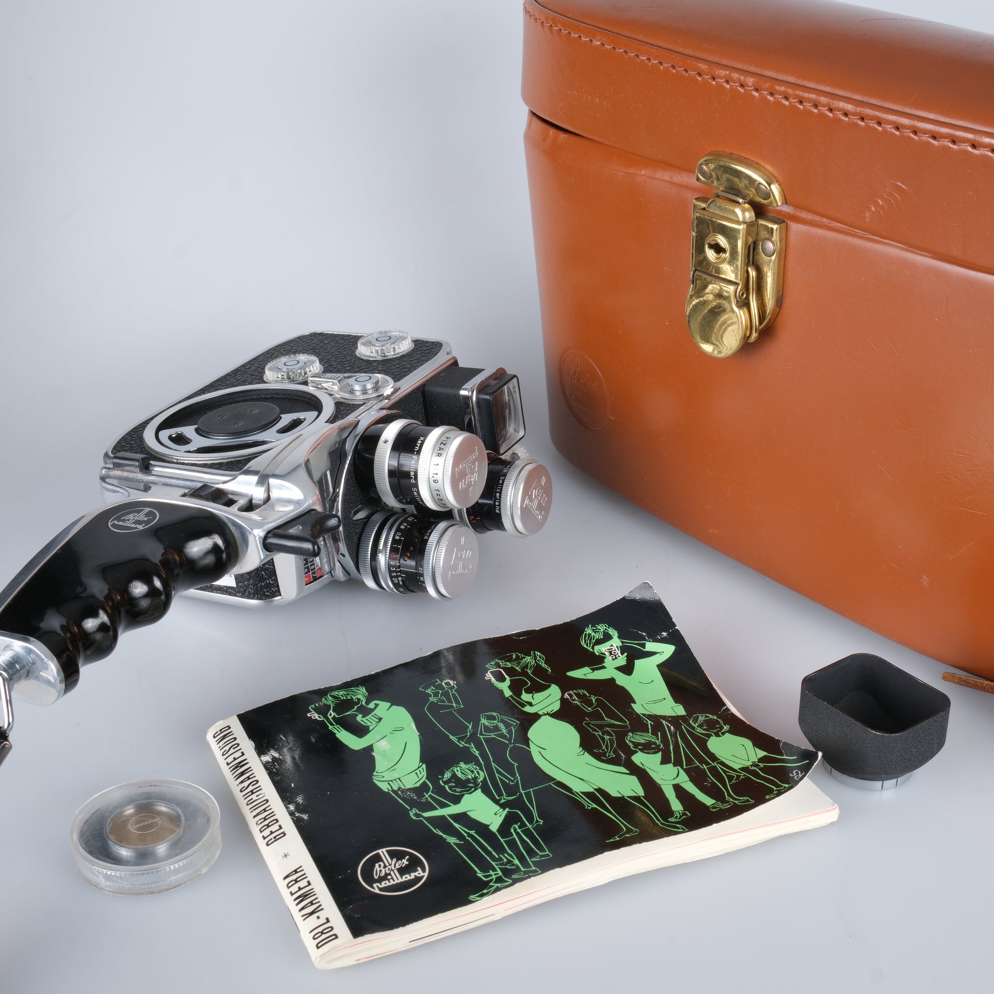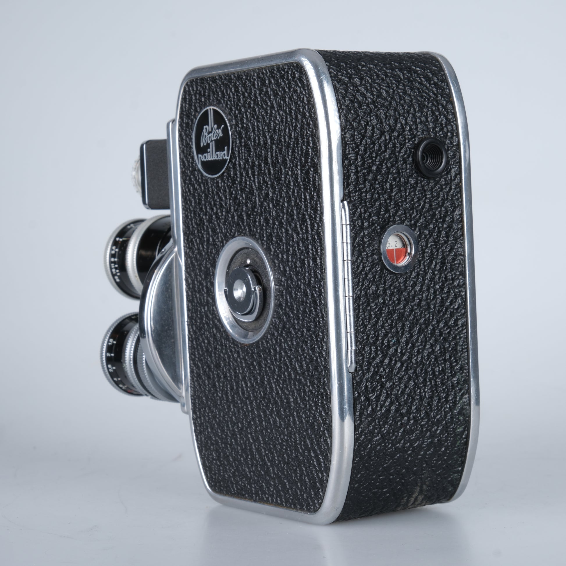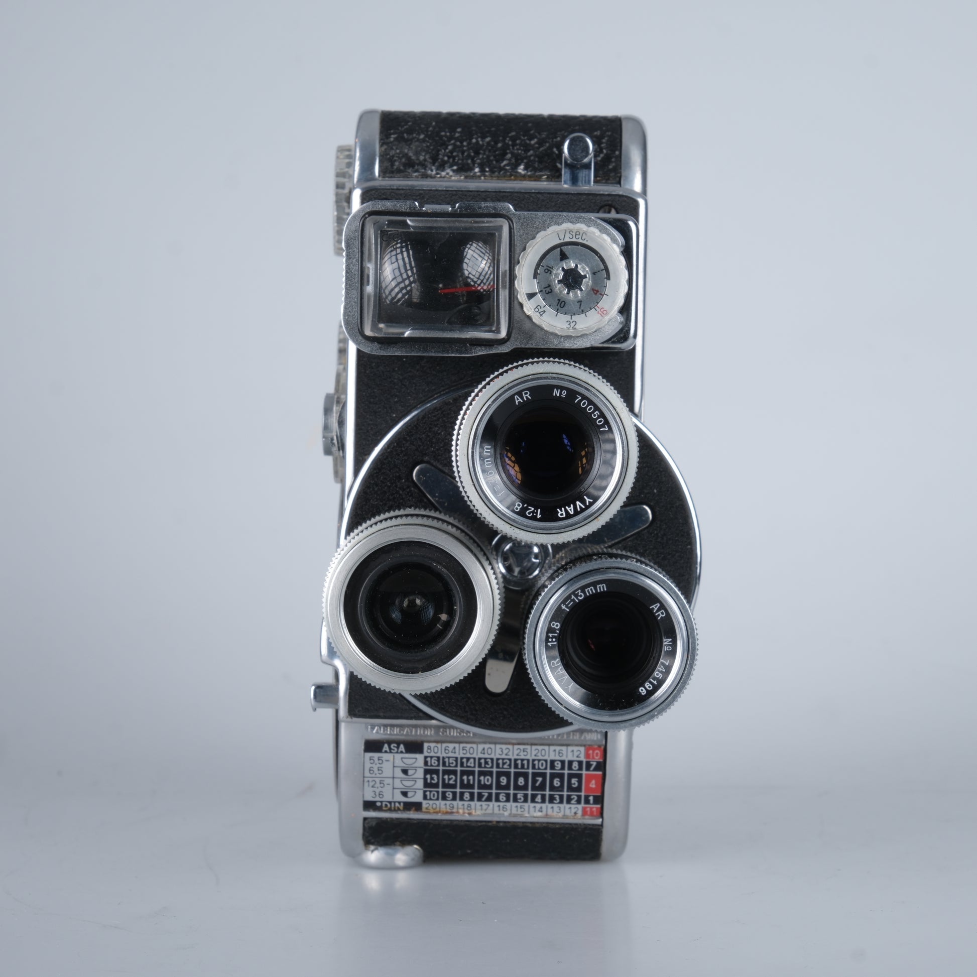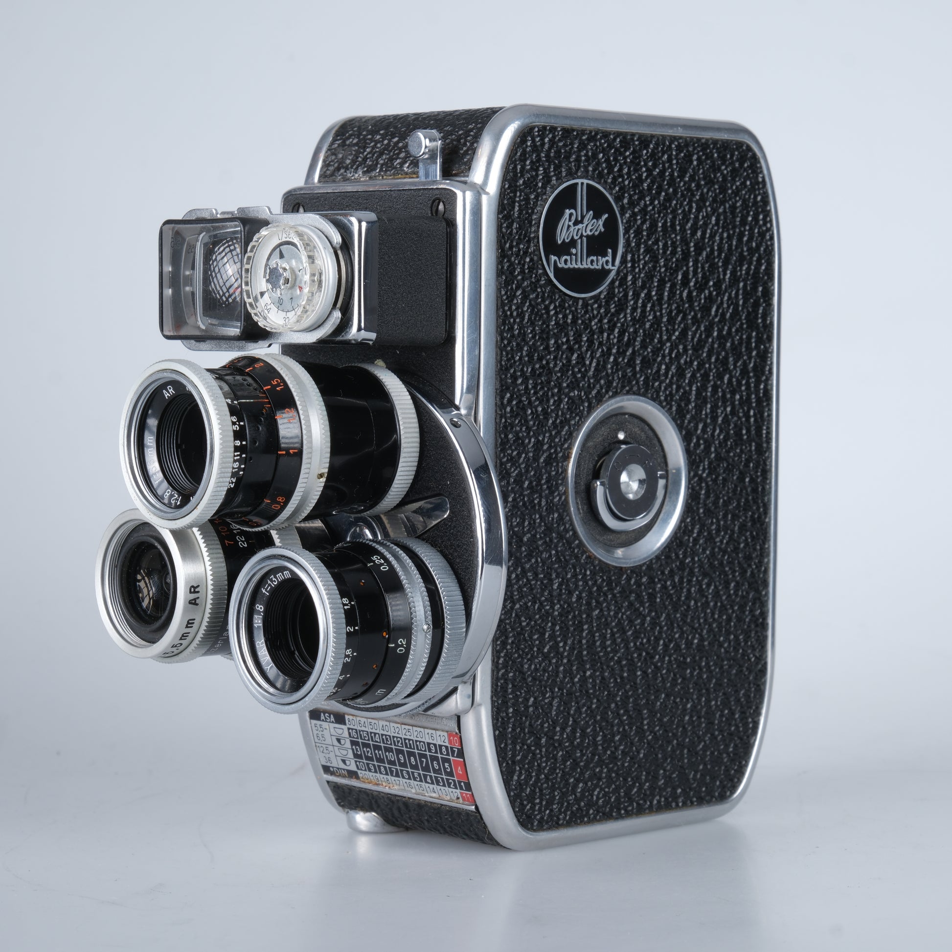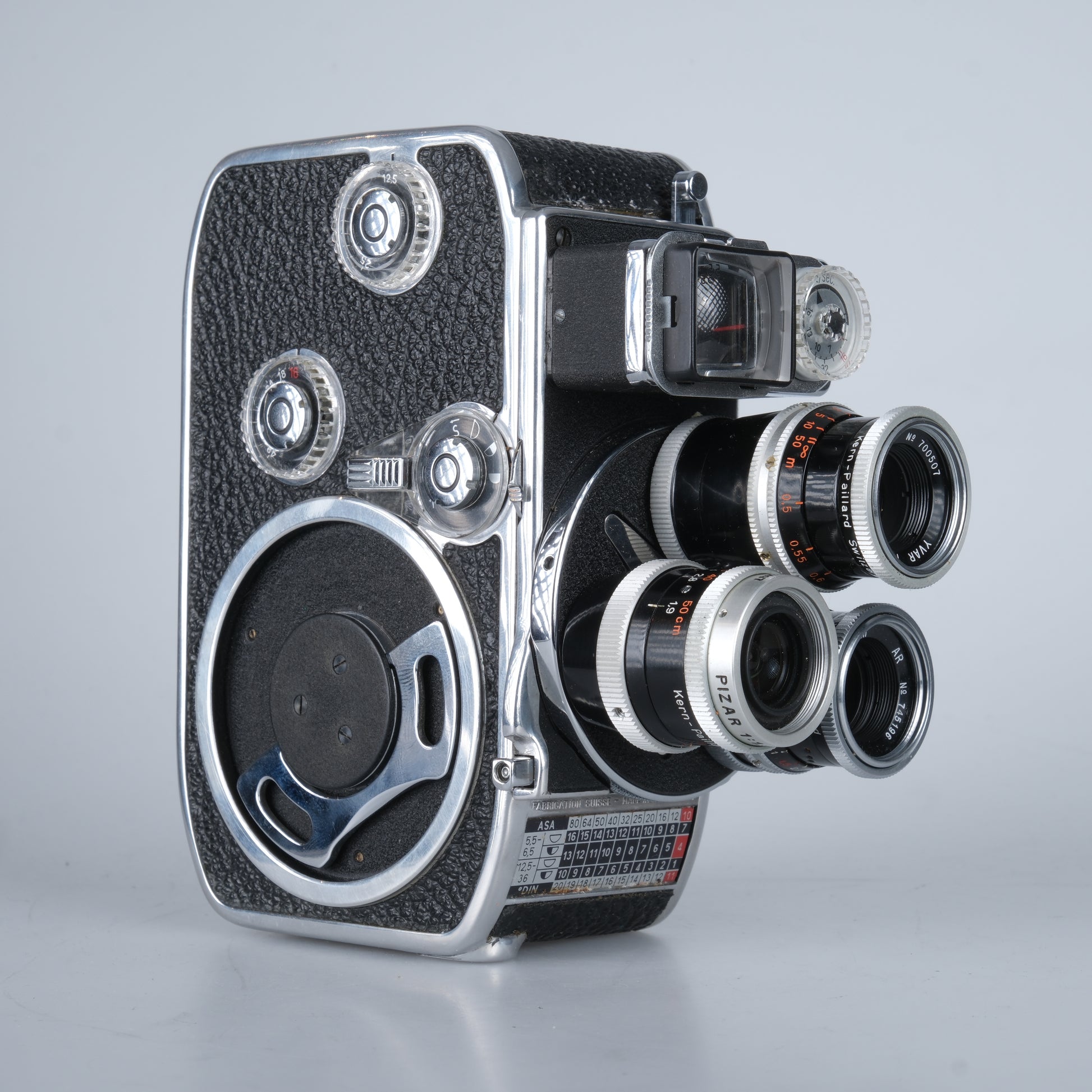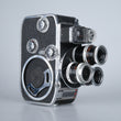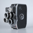 Normal 8 Kamera mit 3 Objektiven auf einem Objektivrevolver, Einzelbilder, 12, 16, 18, 24, 32, 64 Bilder pro Sekunde per zuverlässigem Federwerksantrieb, und ein integrierter Belichtungsmesser.