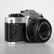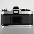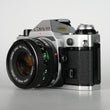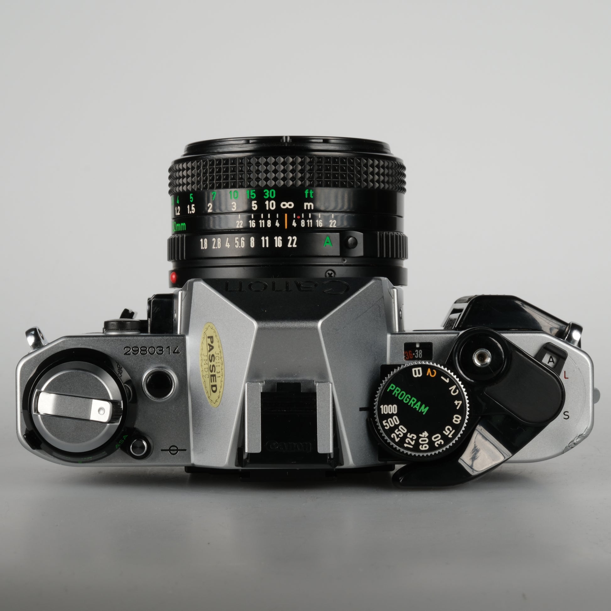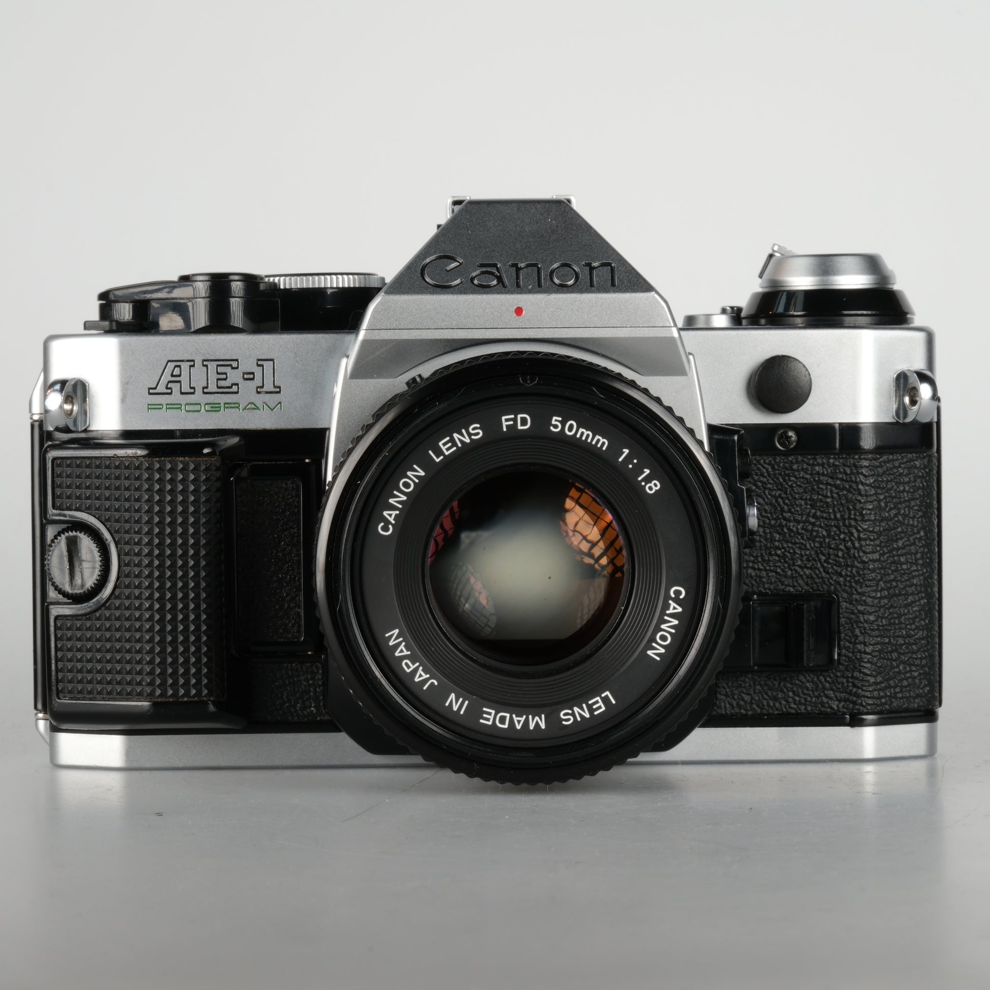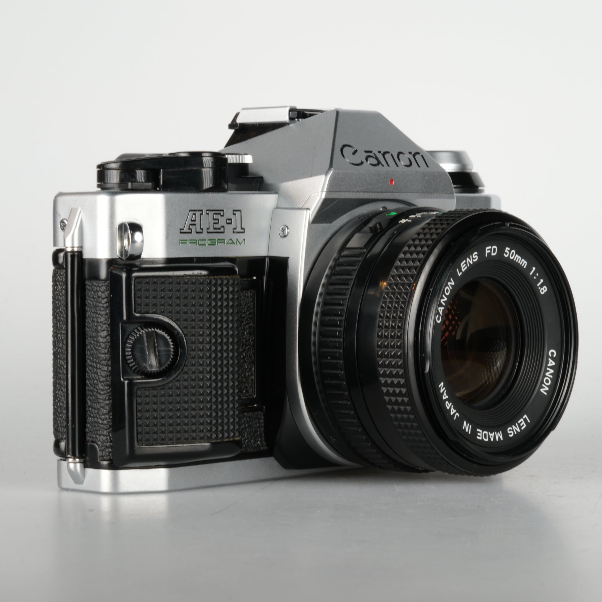 Canon AE-1 35mm Spiegelreflexkamera mit Programm-, Blenden-, Zeitautomatik und manueller Belichtung. Verschlusszeiten: 2 Sek. – 1/1000 Sek. + B. ISO über eingebauten Belichtungsmesser einstellbar (abhängig vom Film). Belichtungsmessung: TTL-Silberzelle. Kompatibel mit Canon FD-Objektiven.