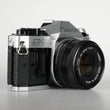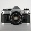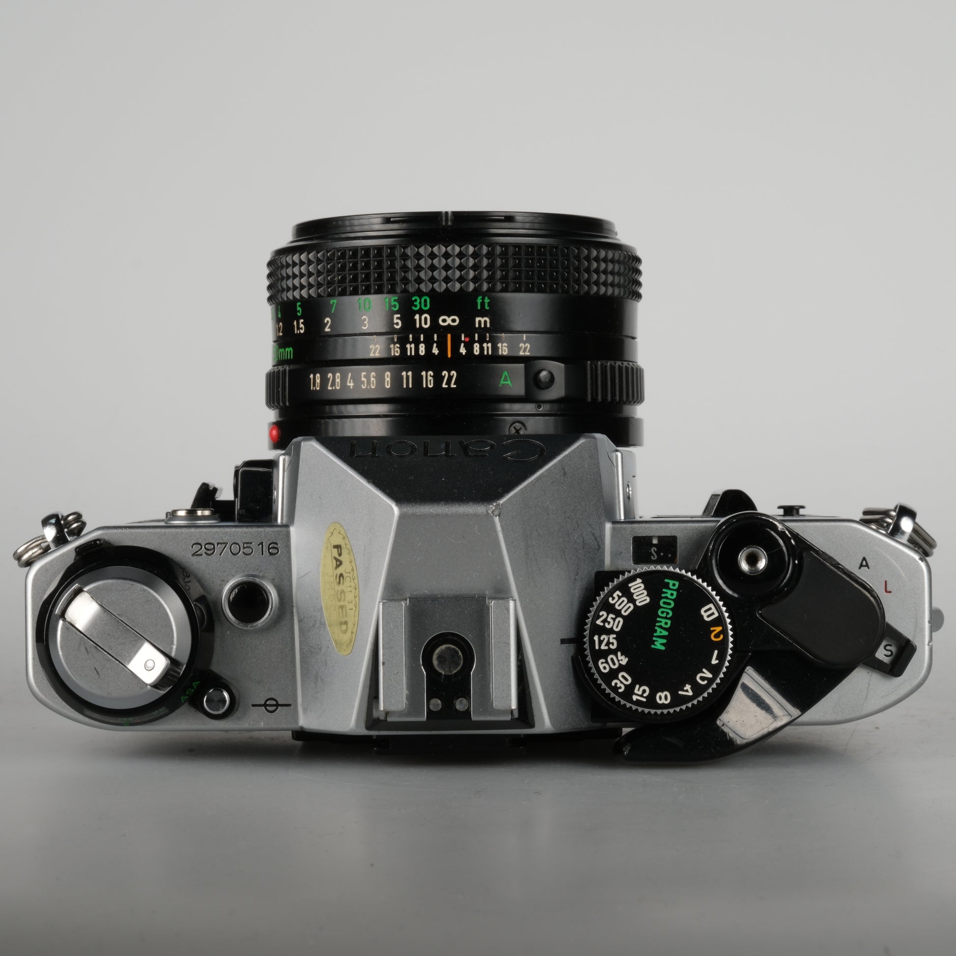 Canon AE-1 35mm Spiegelreflexkamera mit Programm-, Blenden-, Zeitautomatik und manueller Belichtung. Verschlusszeiten: 2 Sek. – 1/1000 Sek. + B. ISO über eingebauten Belichtungsmesser einstellbar (abhängig vom Film). Belichtungsmessung: TTL-Silberzelle. Kompatibel mit Canon FD-Objektiven.