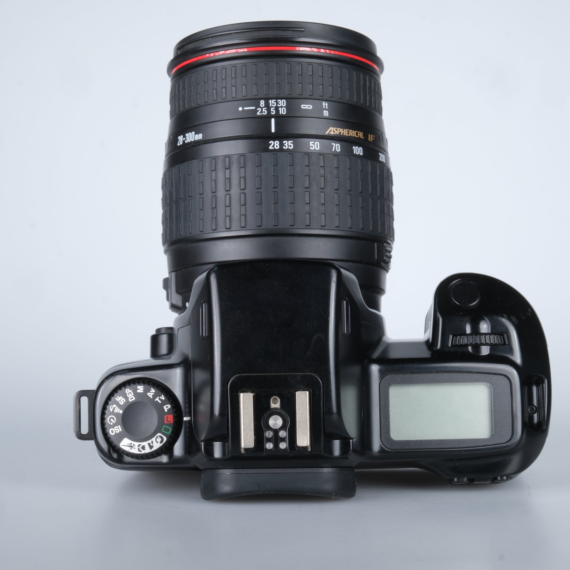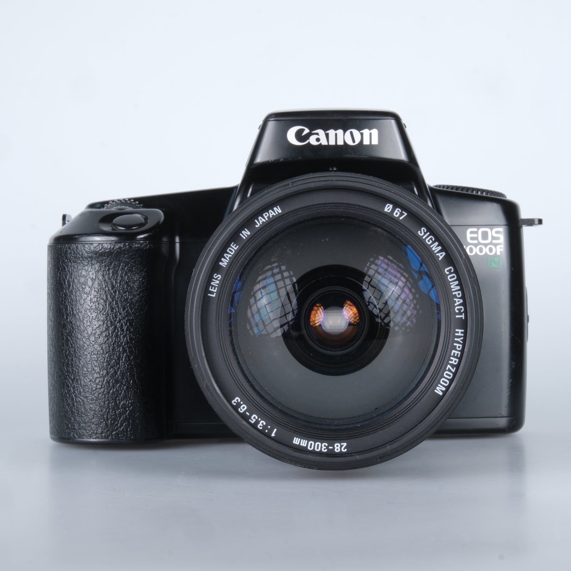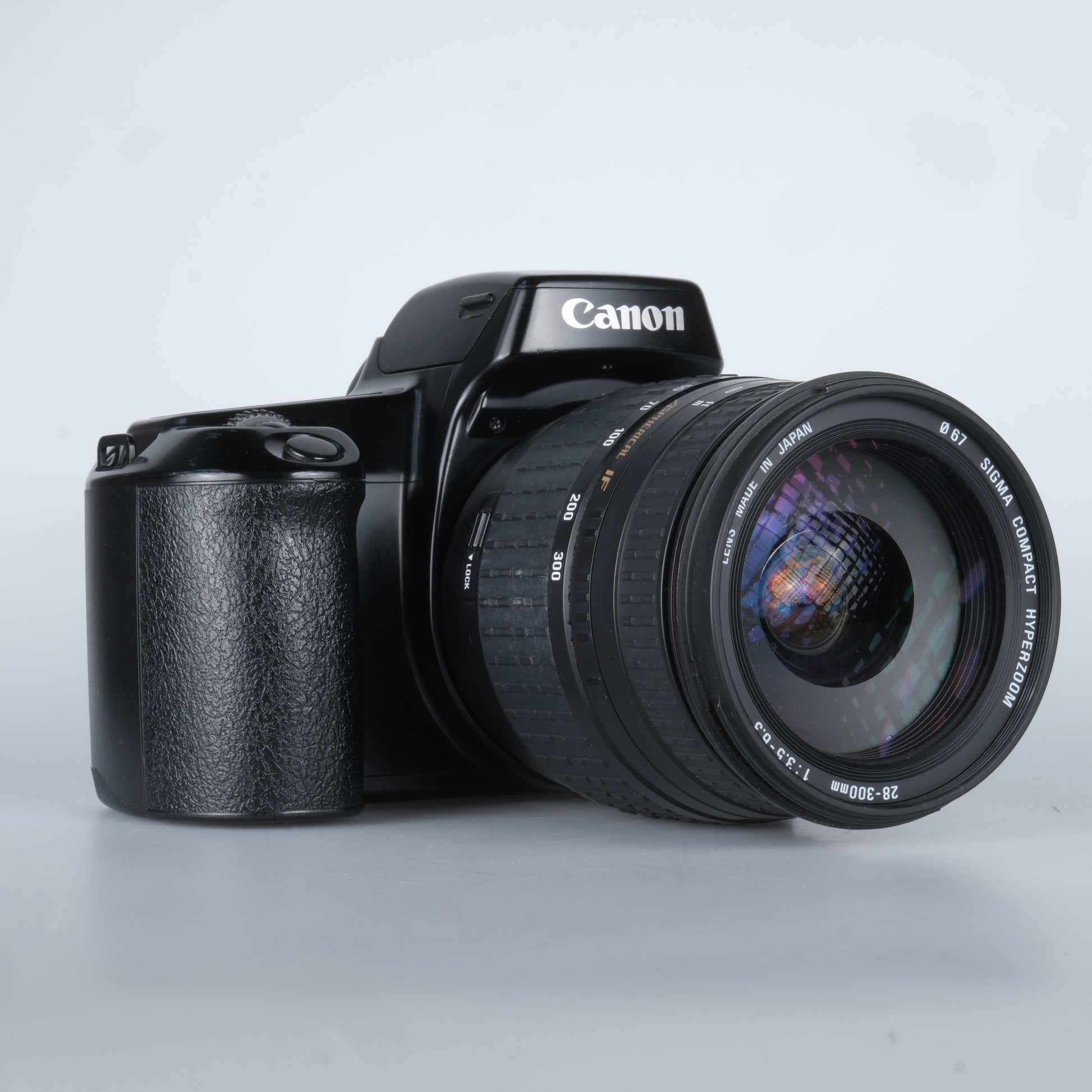 Canon Spiegelreflexkamera mit integriertem Blitz, Autofokus, Manueller modus, Zeitautomatik, Blendenautomatik und Vollautomatik. Die Kamera hat einen Selbstauslöser, interner Belichtungsmesser, Informations-LCD, Motorisierter Filmtransport. Belichtungszeiten "30s - 1/2000s + B, DX-Kodierung für automatische Filmerkennung von 6-6400 ISO Filme.