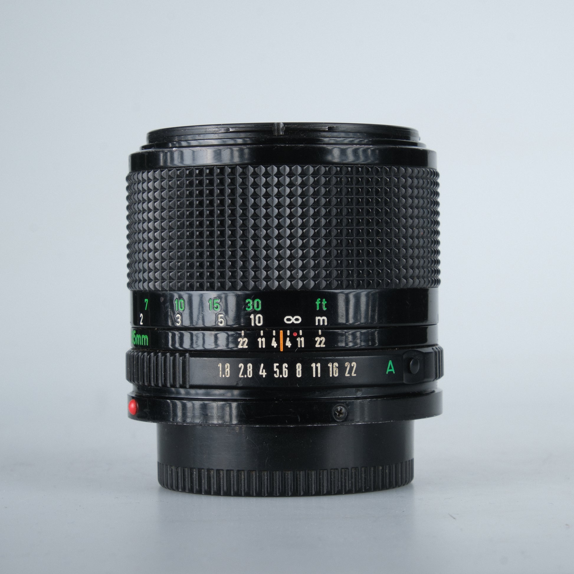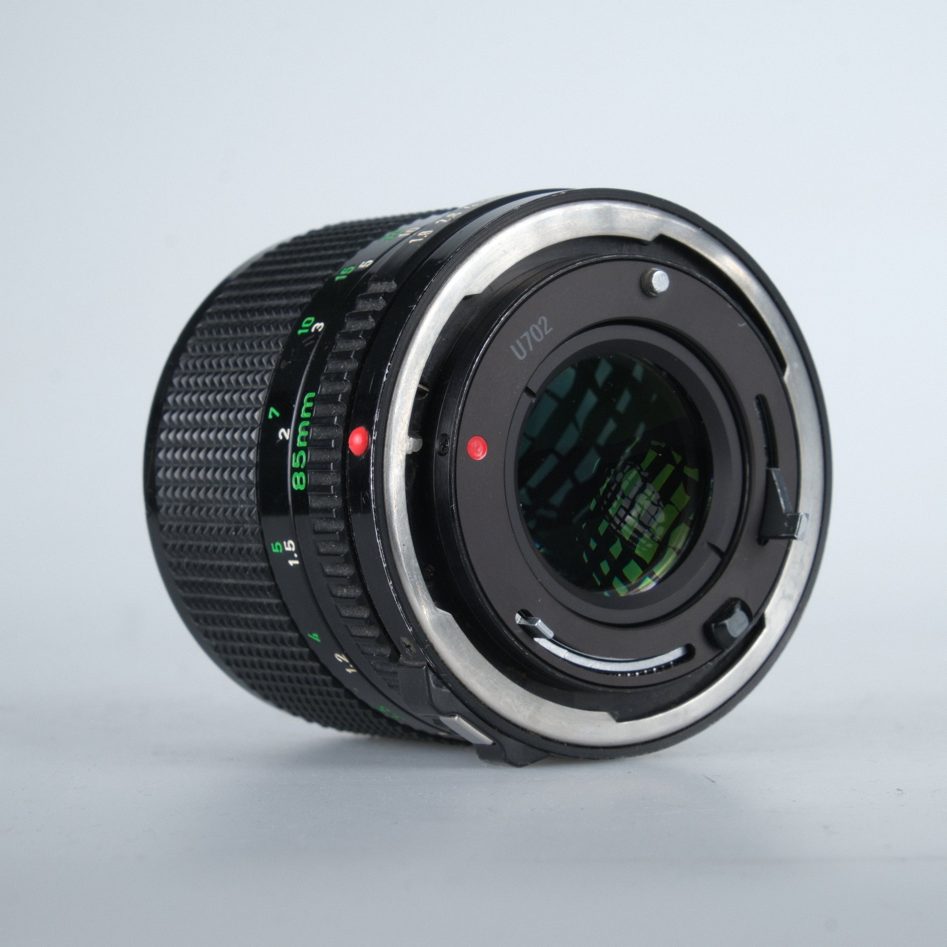 Lichtstarkes Porträtobjektiv für Canon FD, Blendenbereich 1.8-22 + A, Mindestabstand 1 Meter.