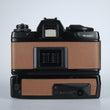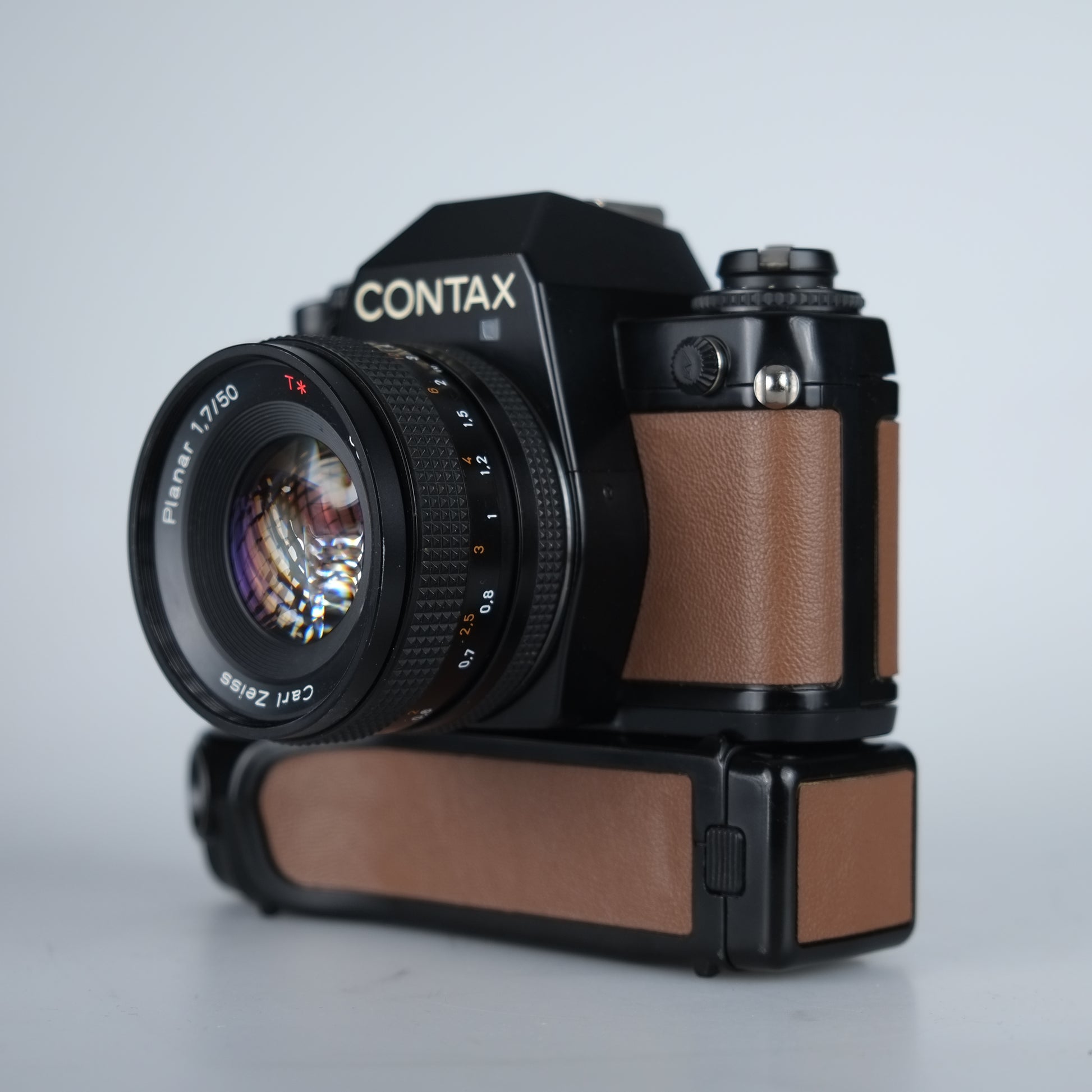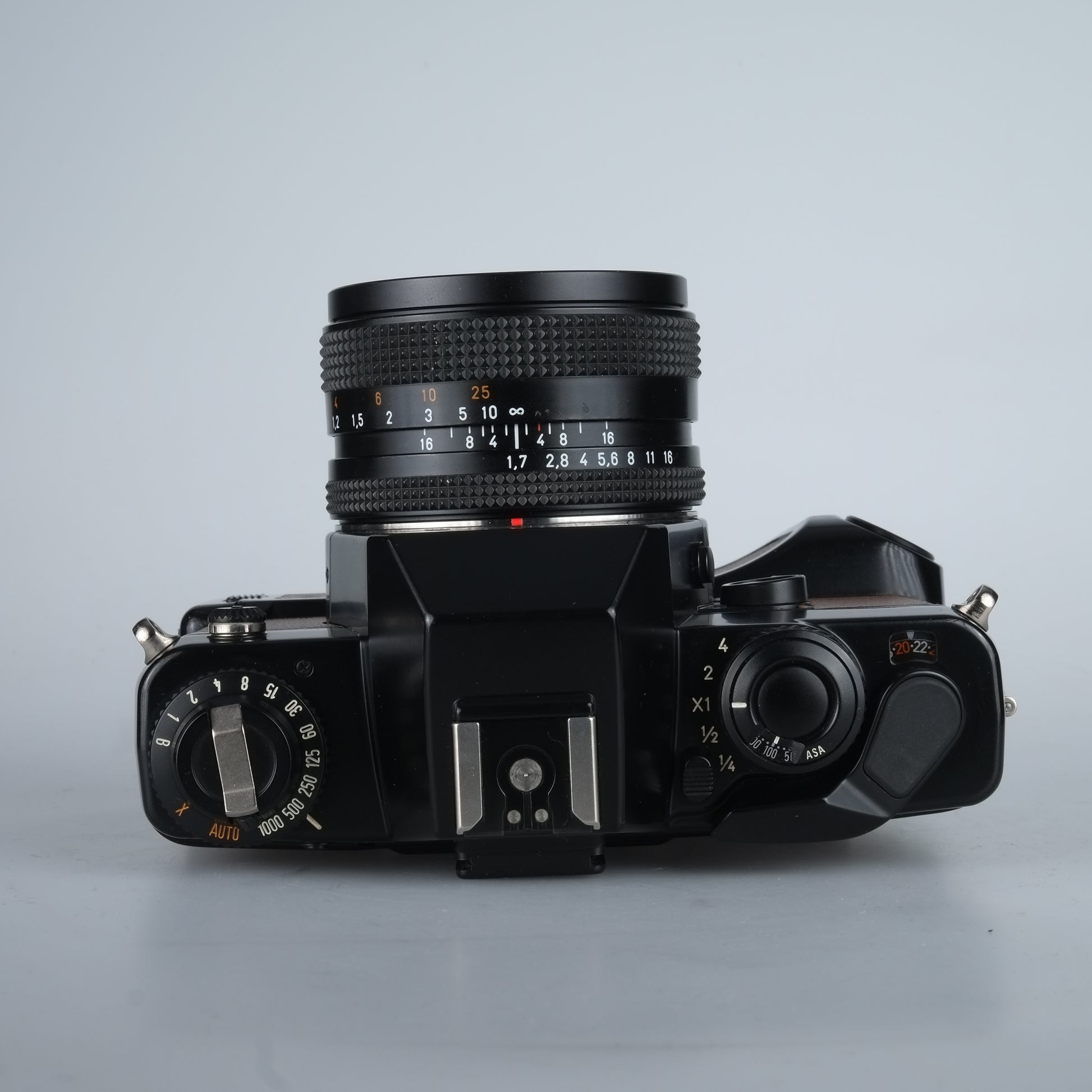 Contax Spiegelreflexkamera mit manueller Belichtung und Zeitautomatik, Vertikal laufender Metall-Lamellen-Schlitzverschluß mit Verschlusszeiten 1 Sek. - 1/1000 Sek. + B, ISO 25-1600, Belichtungskorrektur +-2 und elektronischer Selbstauslöser.
