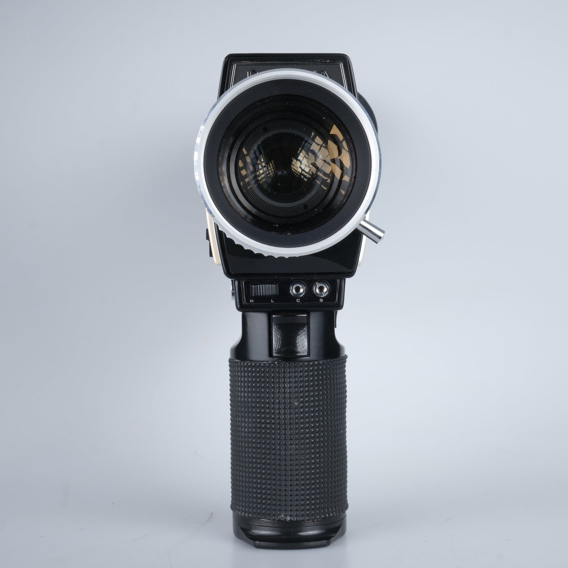 Super 8 Kamera mit 18 und 24 Bilder pro Sekunde + Einzelbildschaltung mit Drahtauslöser, automatische und manuelle Belichtung mit Gegenlichtkorrektur.