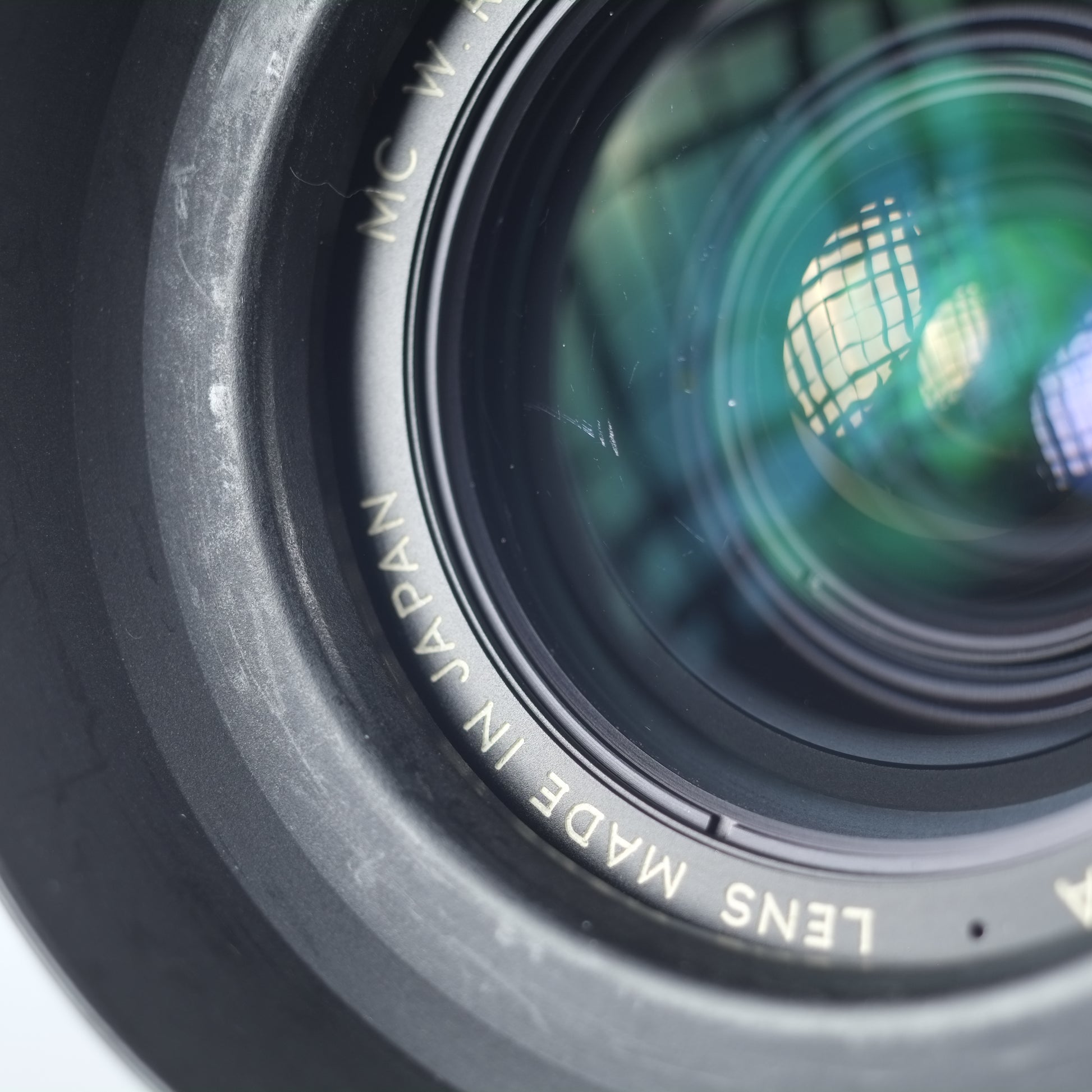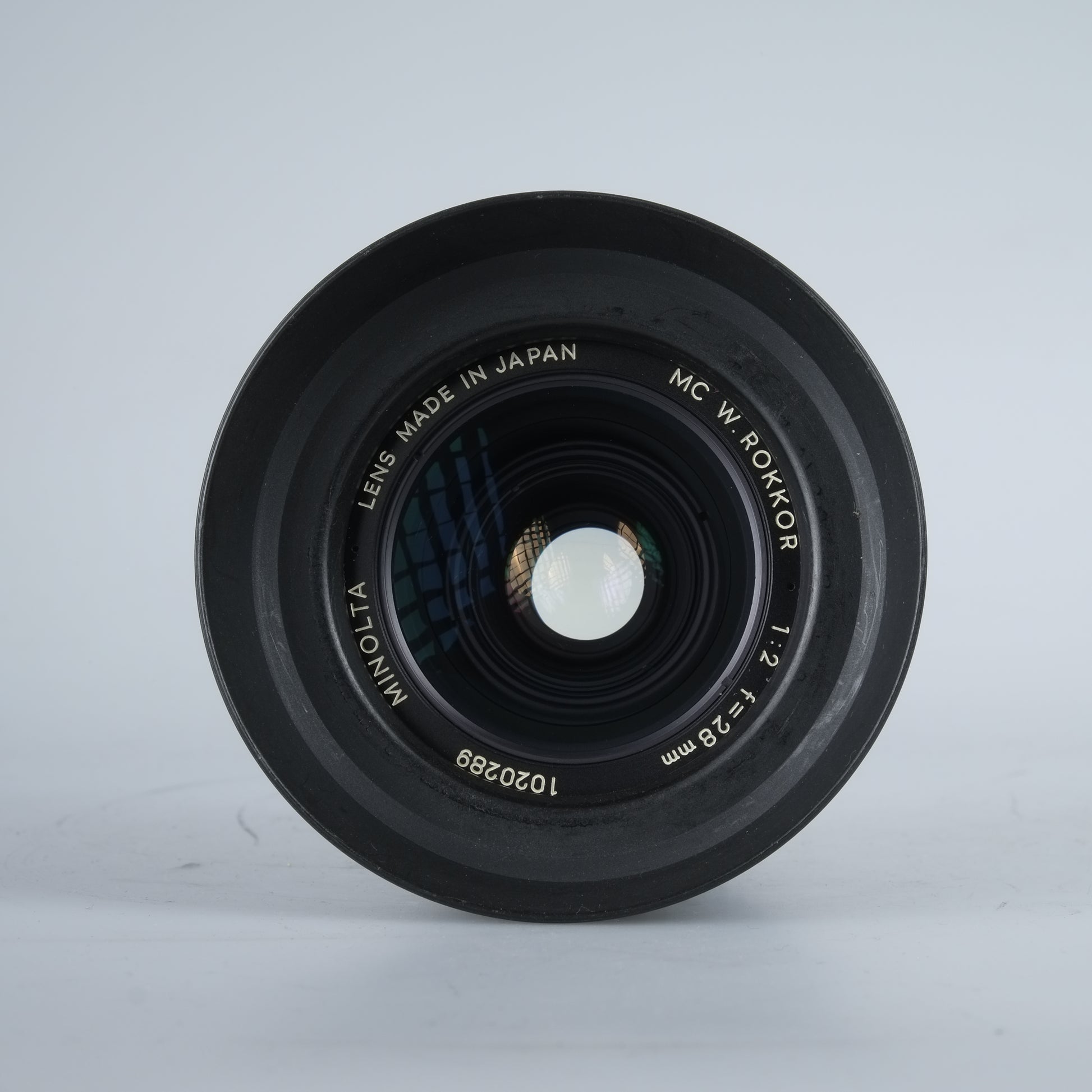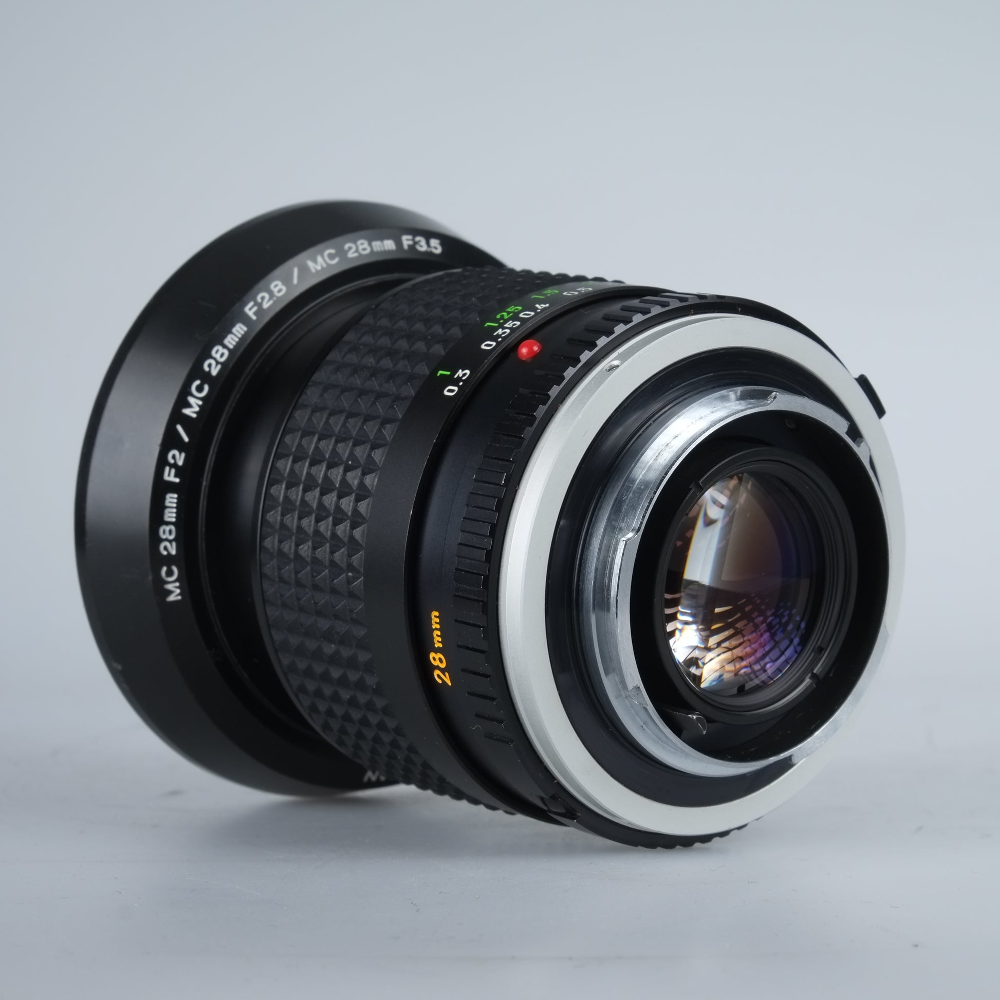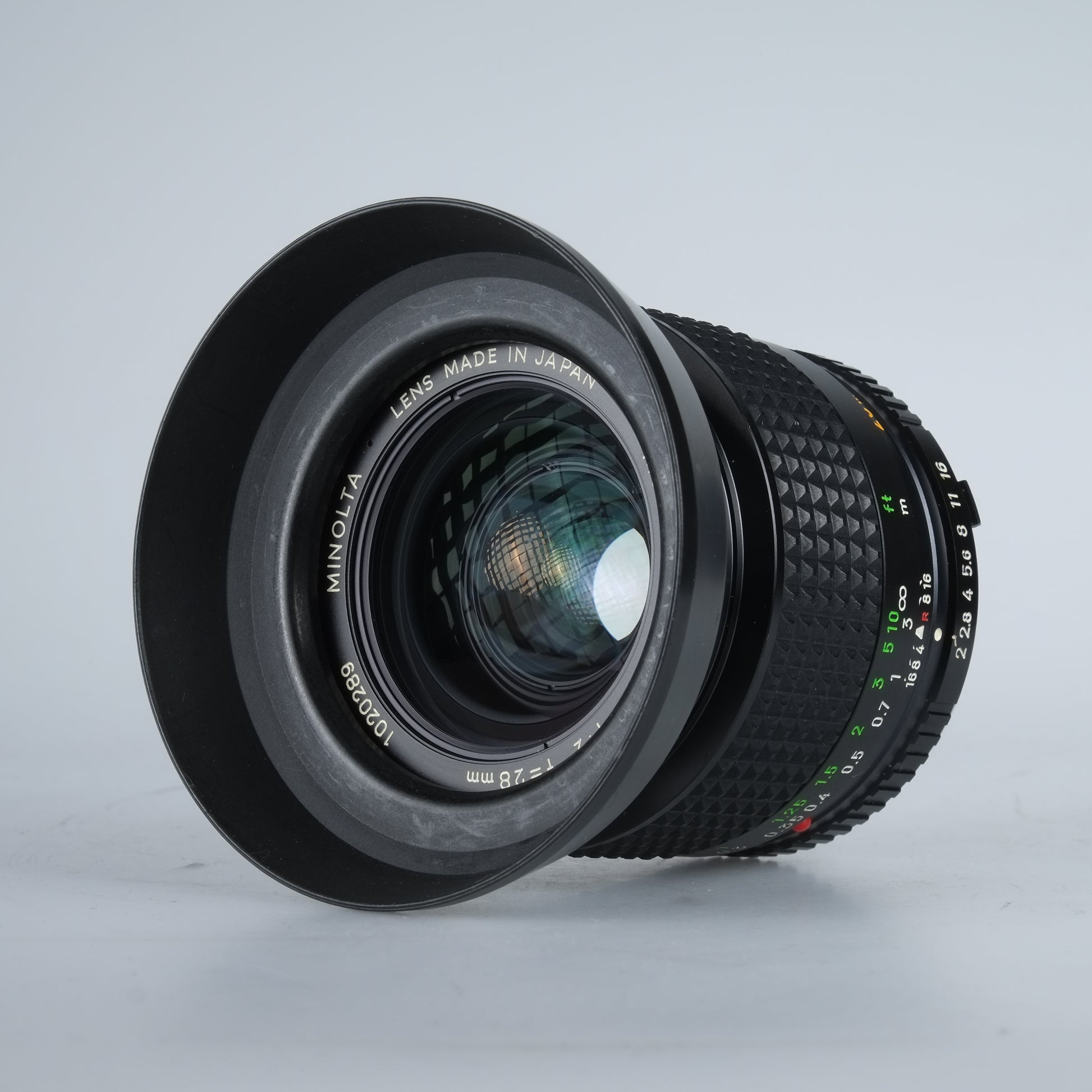 Lichtstarkes Weitwinkelobjektiv für Minolta Kameras, MC Variante ohne Blendenautomatik. Blendenbereich 2-16, Mindestabstand 0.3m.