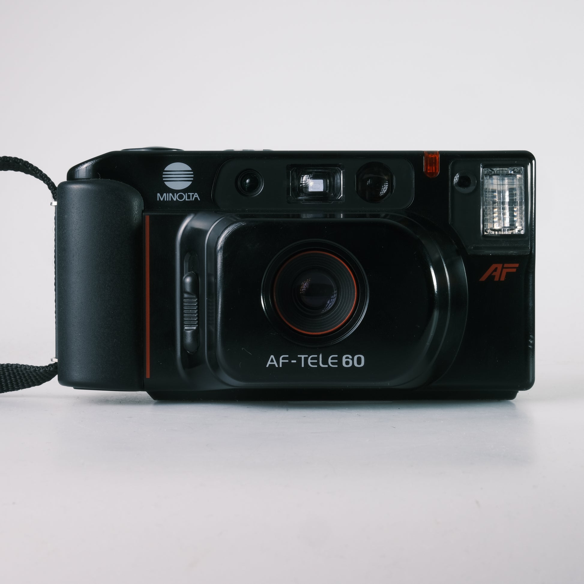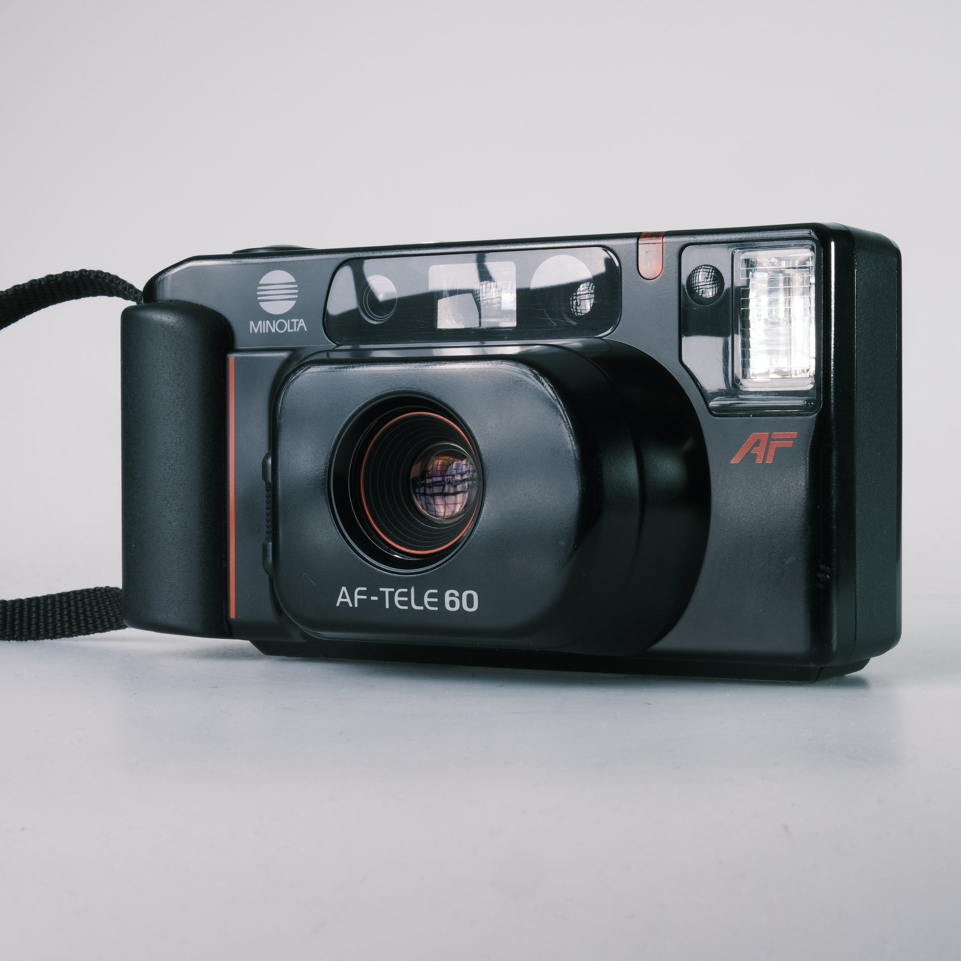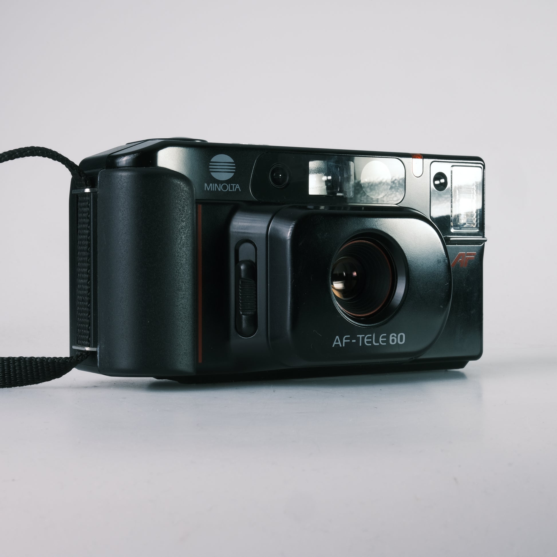 Vollautomatische Sucherkamera mit Autofokus, Blitz, automatischer Filmtransport und Tele oder Weitwinkel Brennweite auf Knopfdruck.