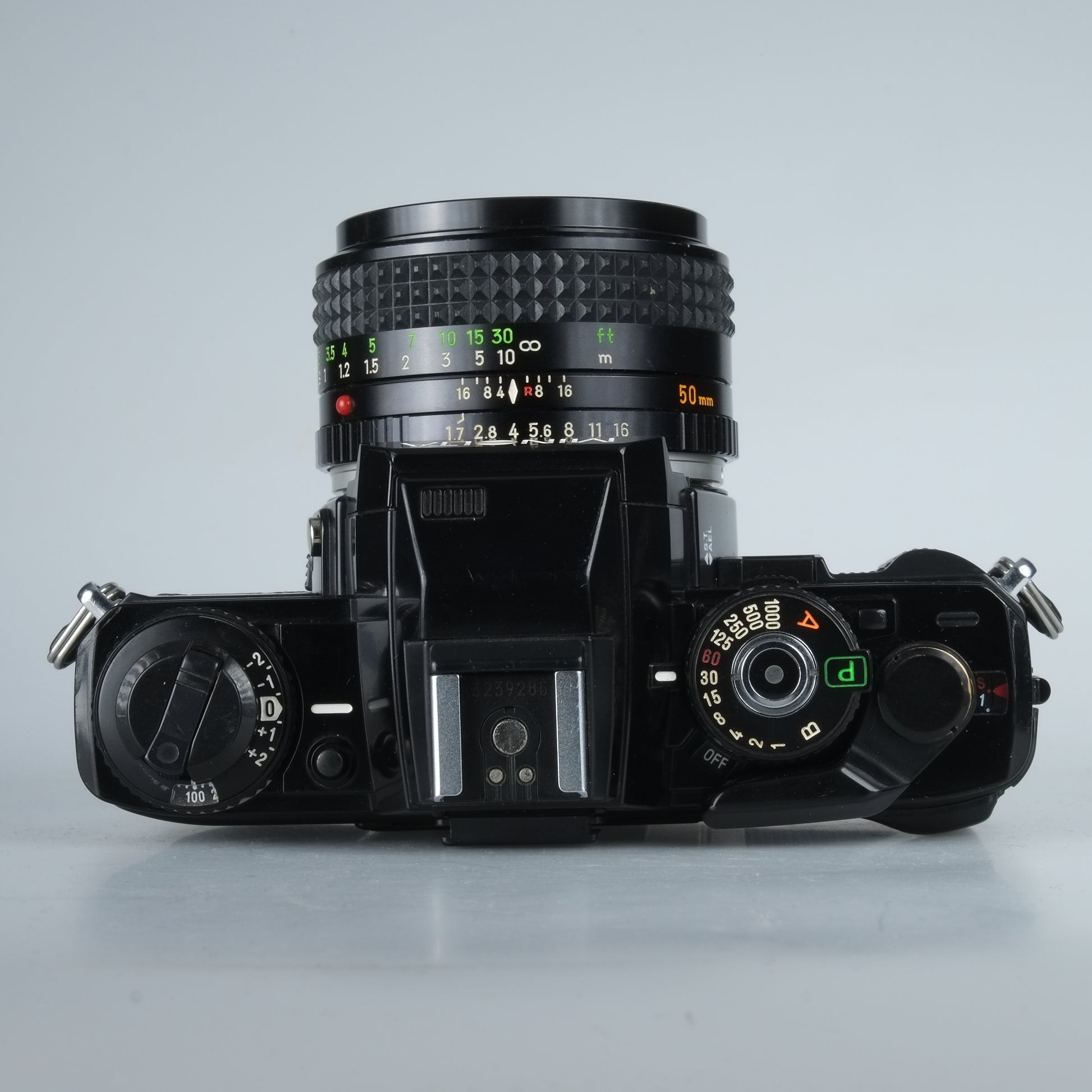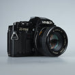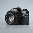 Hochwertige Kleinbildspiegelreflexkamera mit Programmautomatik, Zeitautomatik und manuelle Belichtungeinstellung. Verschlusszeiten 1 Sek. - 1/1000 Sek. + B, Belichtungskorrektur +-2 und Selbstauslöser.