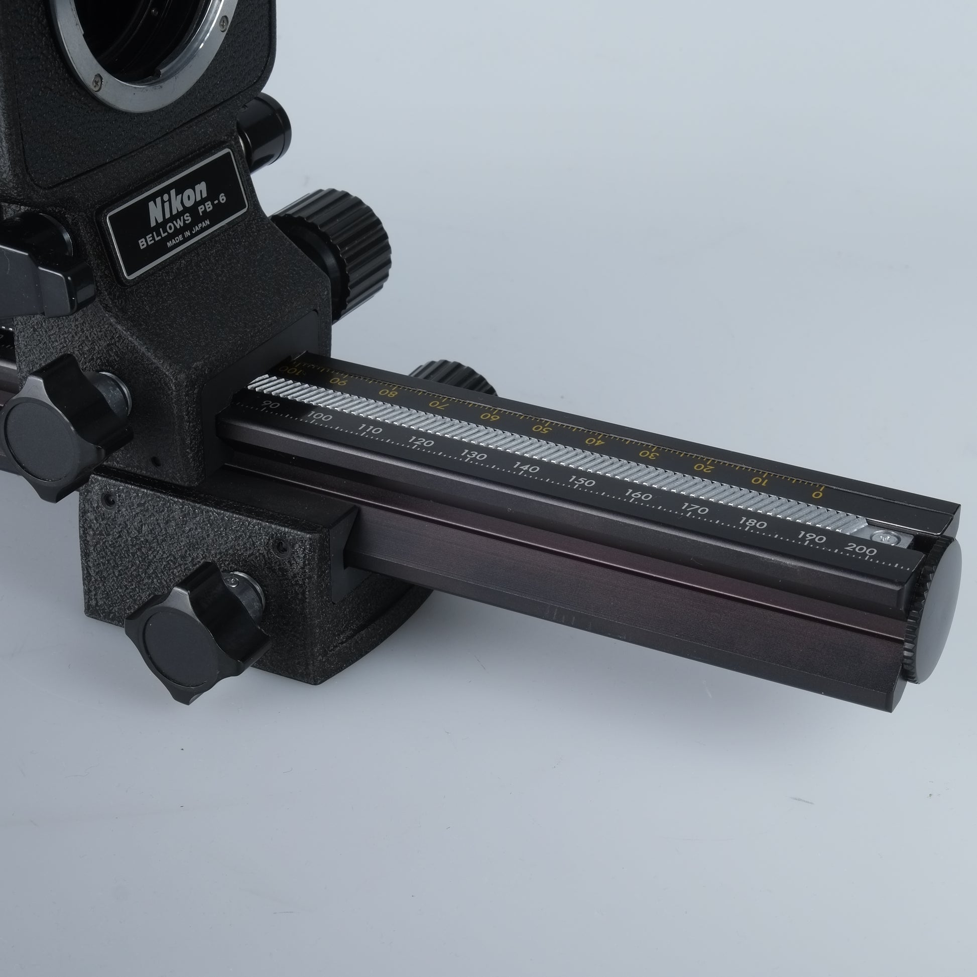 Beim Balgengerät PB-6 lässt sich der Balgenauszug zwischen 48 mm und 208 mm variieren, Nikon F Anschluss für Objektive mit manueller Fokussierung.