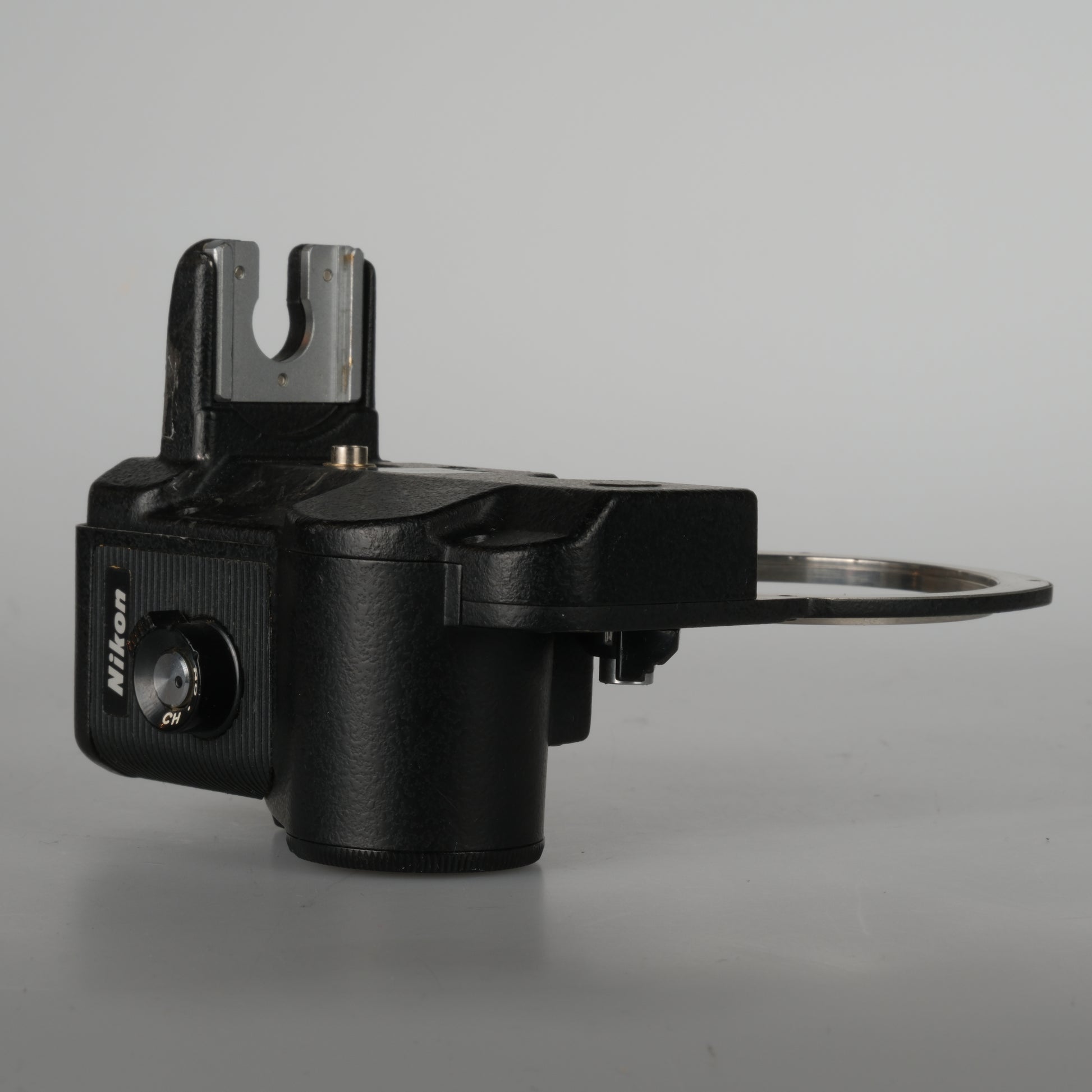 Mechanischer EE-Blendenmotoraufsatz für Nikon F2S-Kameras, der in Verbindung mit dem Photomic-Sucher die Belichtungsmessung automatisch ausführt und über einen internen Antrieb die Objektivblende passend zur gewählten Verschlusszeit einstellt.