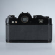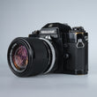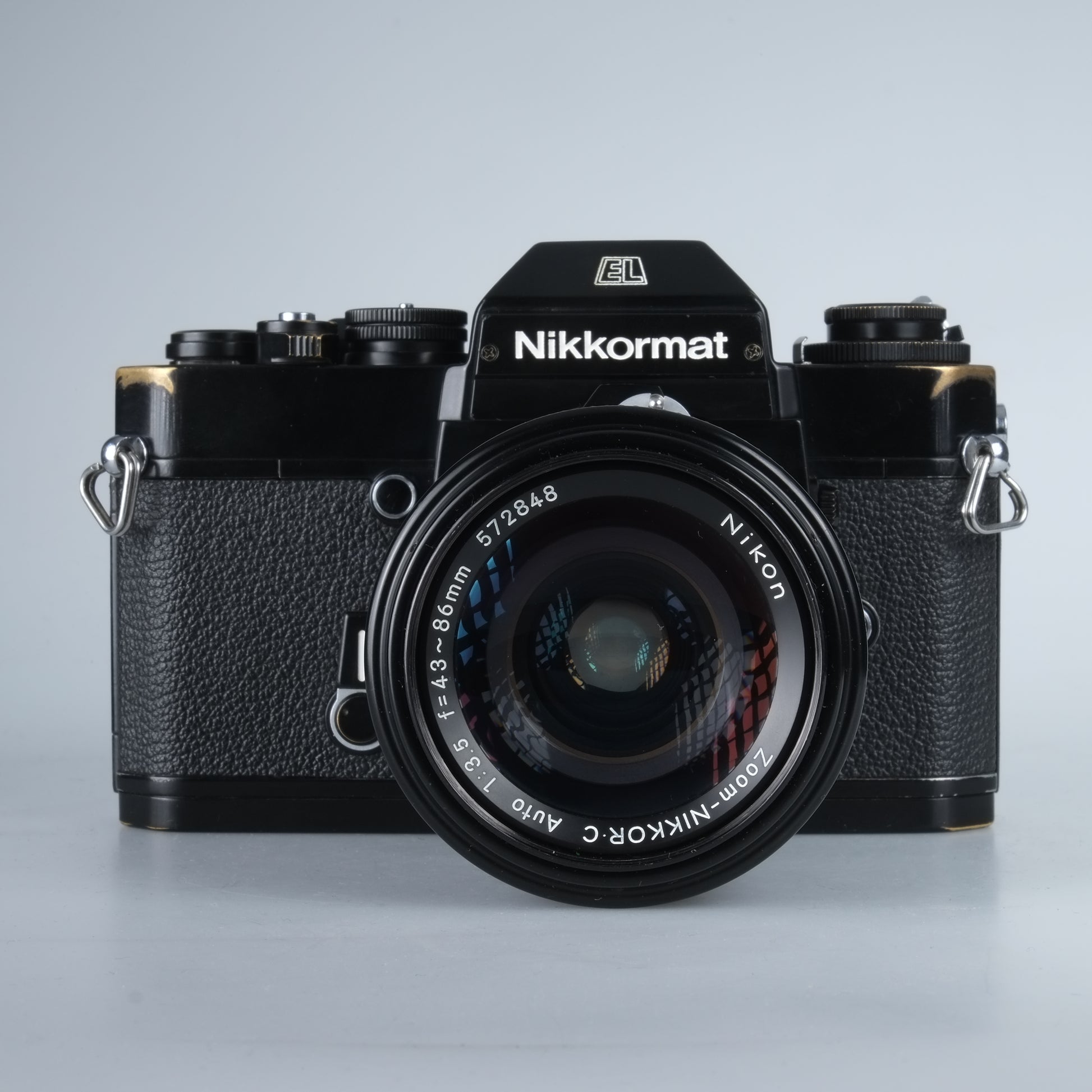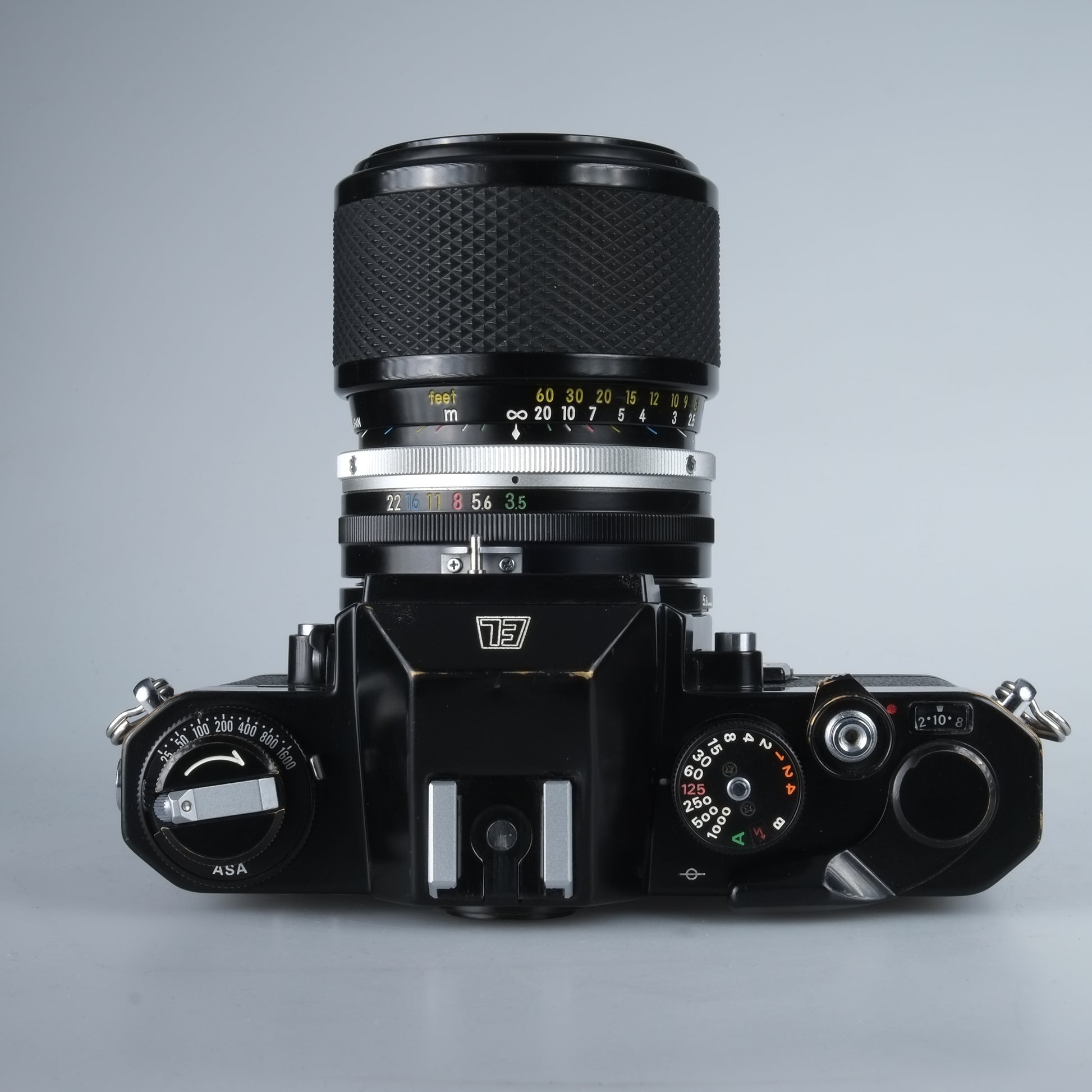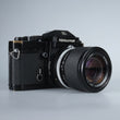 Nikon Spiegelreflexkamera mit internem Belichtungsmesser, ISO 12-3200, Belichtungskorrektur +-2, Verschlussautomatik und Manueller Modus, Verschlusszeiten 8 Sek. - 1/1000 Sek. + B. Manueller Filmtransport.