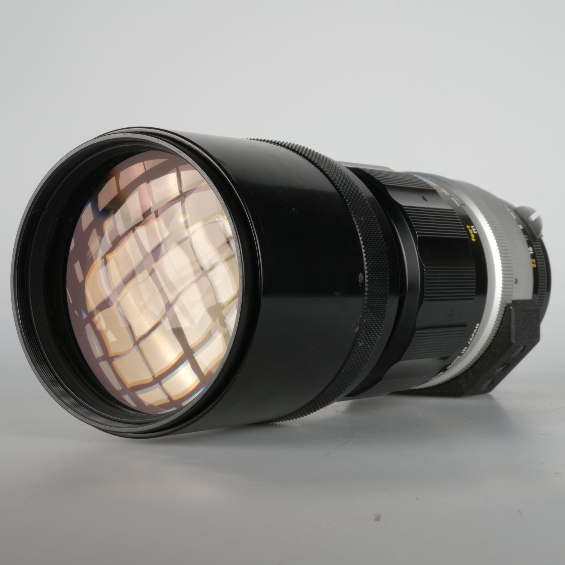 Nikon F Teleobjektiv, Brennweite 300mm, Blendenbereich 4.5–32, manuelle Fokussierung.