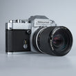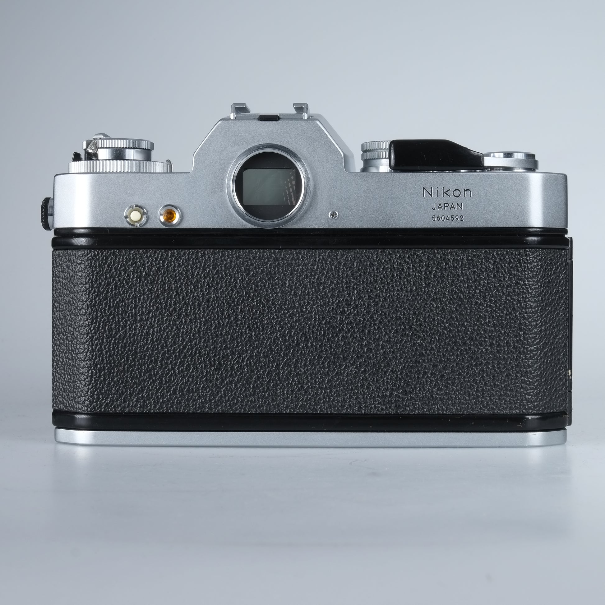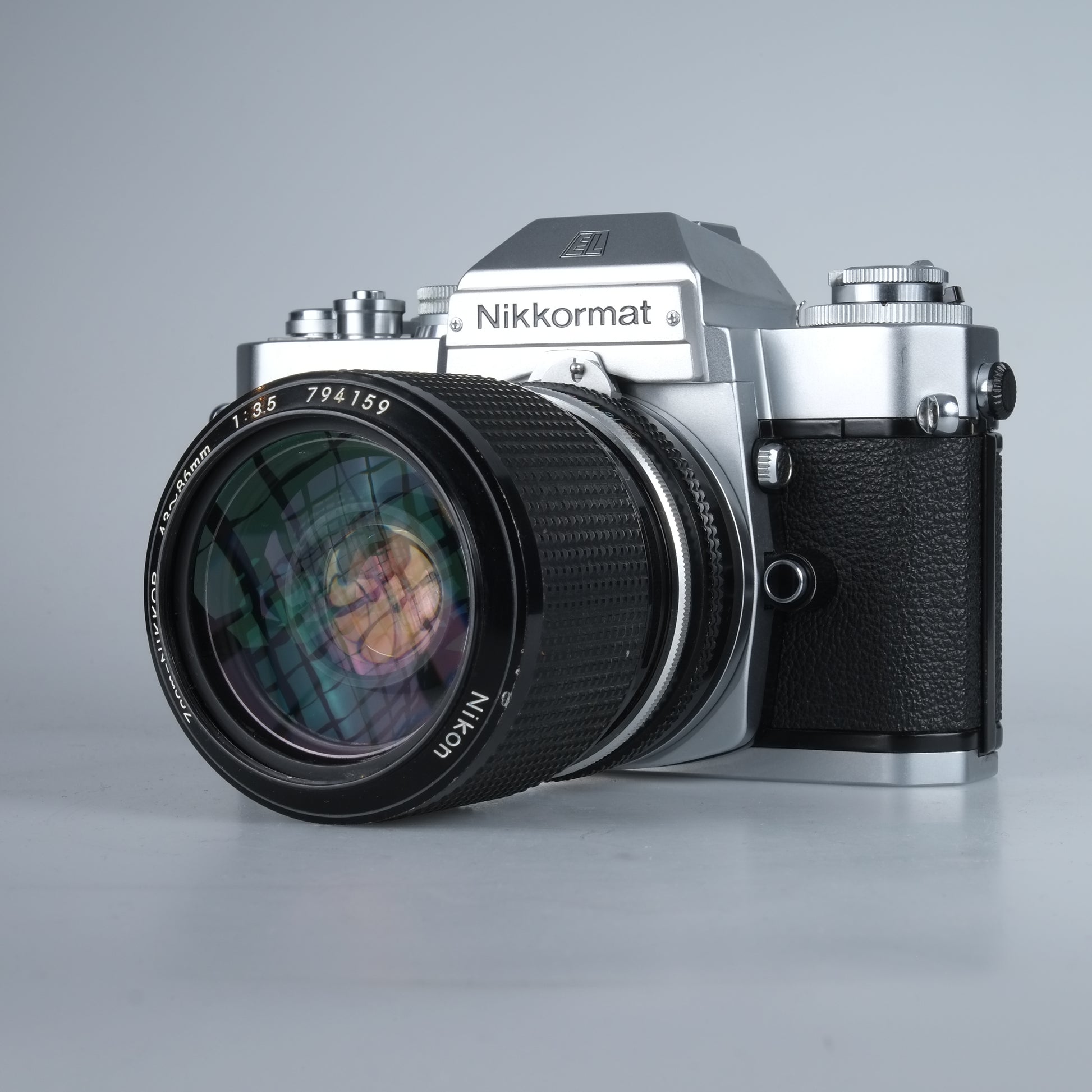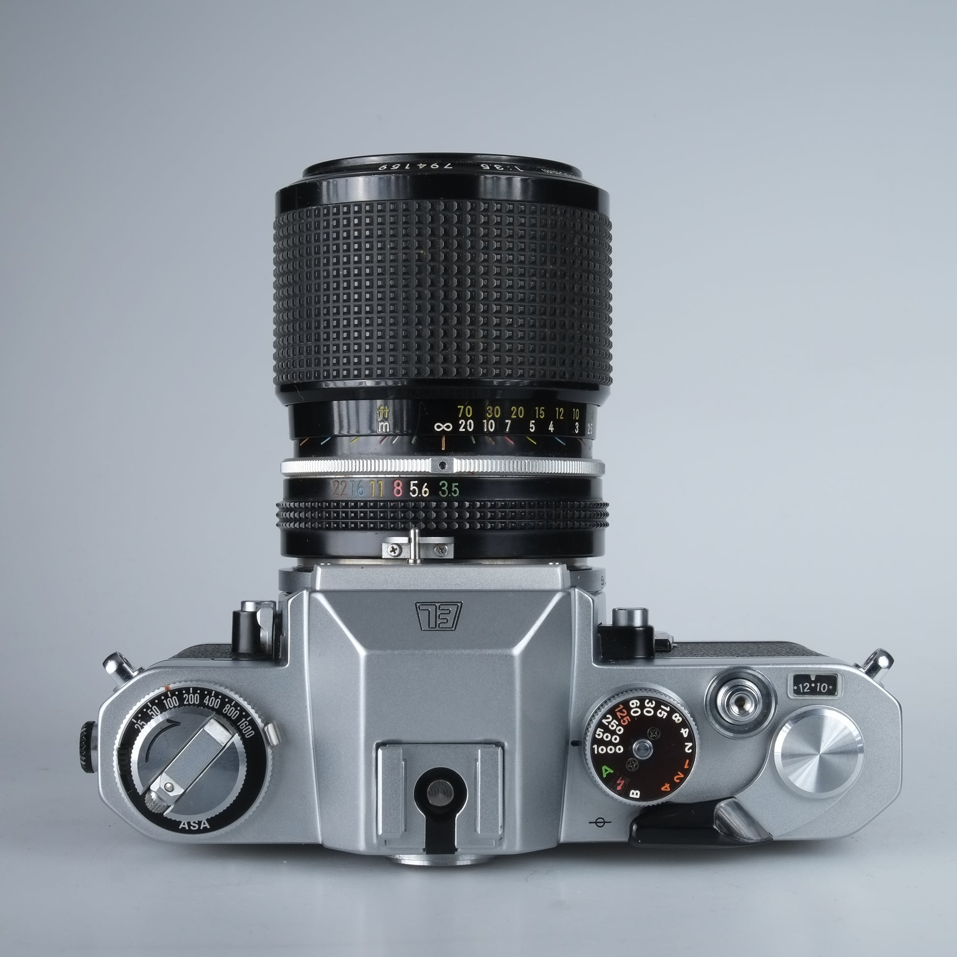 Nikon Spiegelreflexkamera mit internem Belichtungsmesser, ISO 12-3200, Belichtungskorrektur +-2, Verschlussautomatik und Manueller Modus, Verschlusszeiten 8 Sek. - 1/1000 Sek. + B. Manueller Filmtransport.