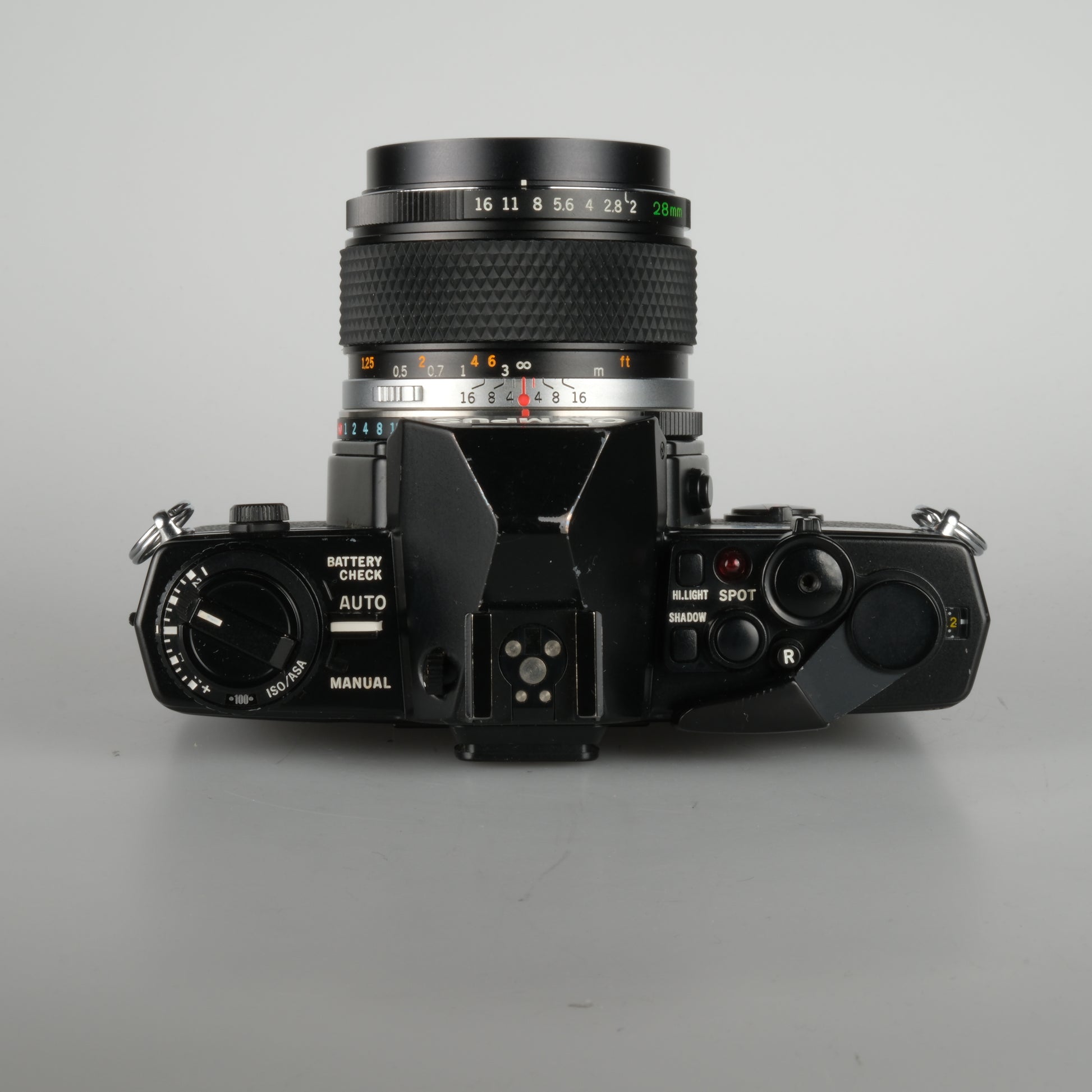 Olympus Spiegelreflexkamera mit mittenbetonter integraler Zeitautomatik, 2%-Spotmessung mit maximal 8 Spotpunkten, manueller Modus, Programmautomatik. Belichtungskorrektur +/- 2 Blenden, Verschlusszeiten 240 Sek. - 1/2000 Sek. + B, ISO 6-3200, Selbstauslöser und manueller Filmtransport.