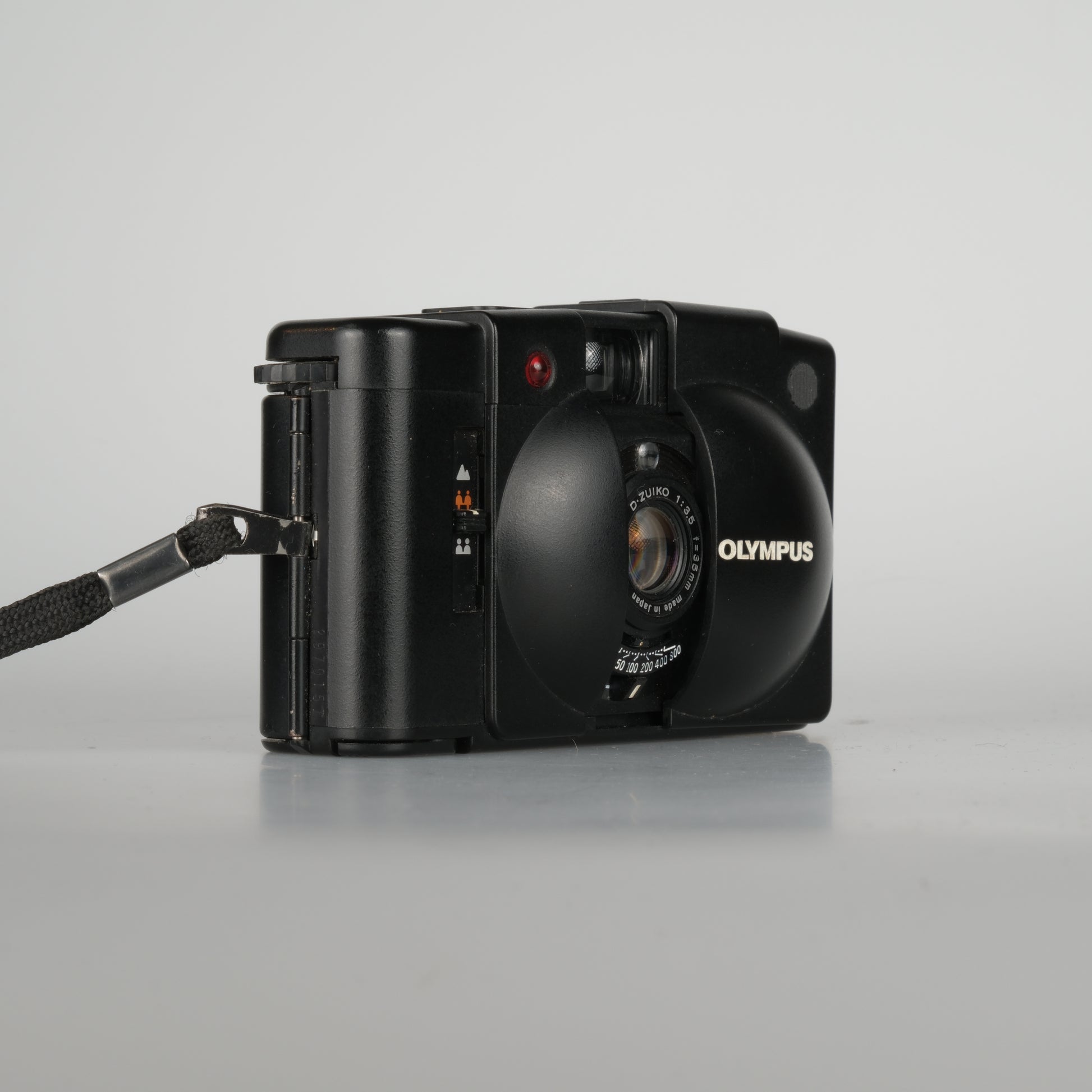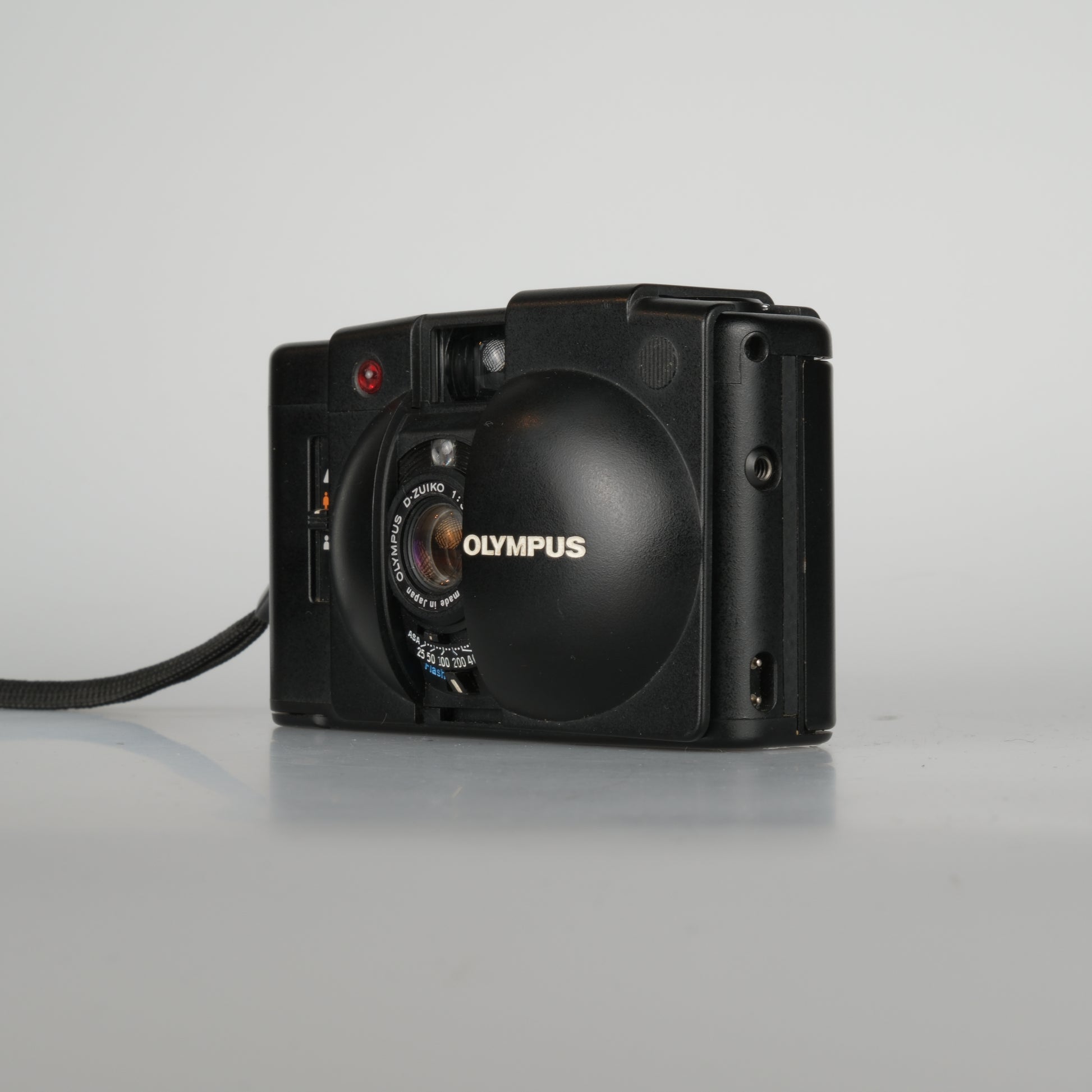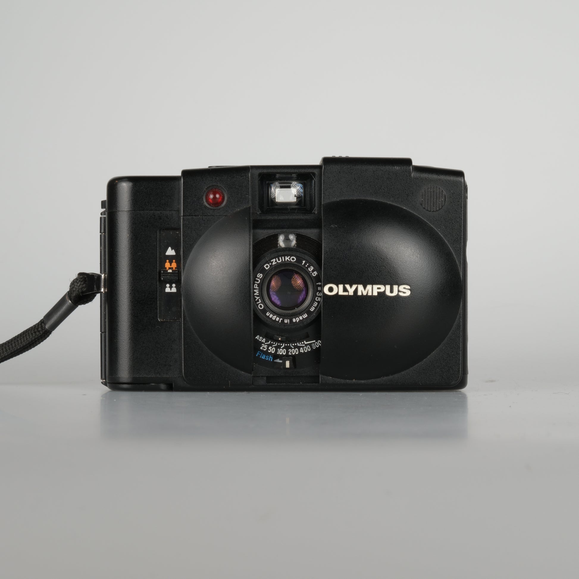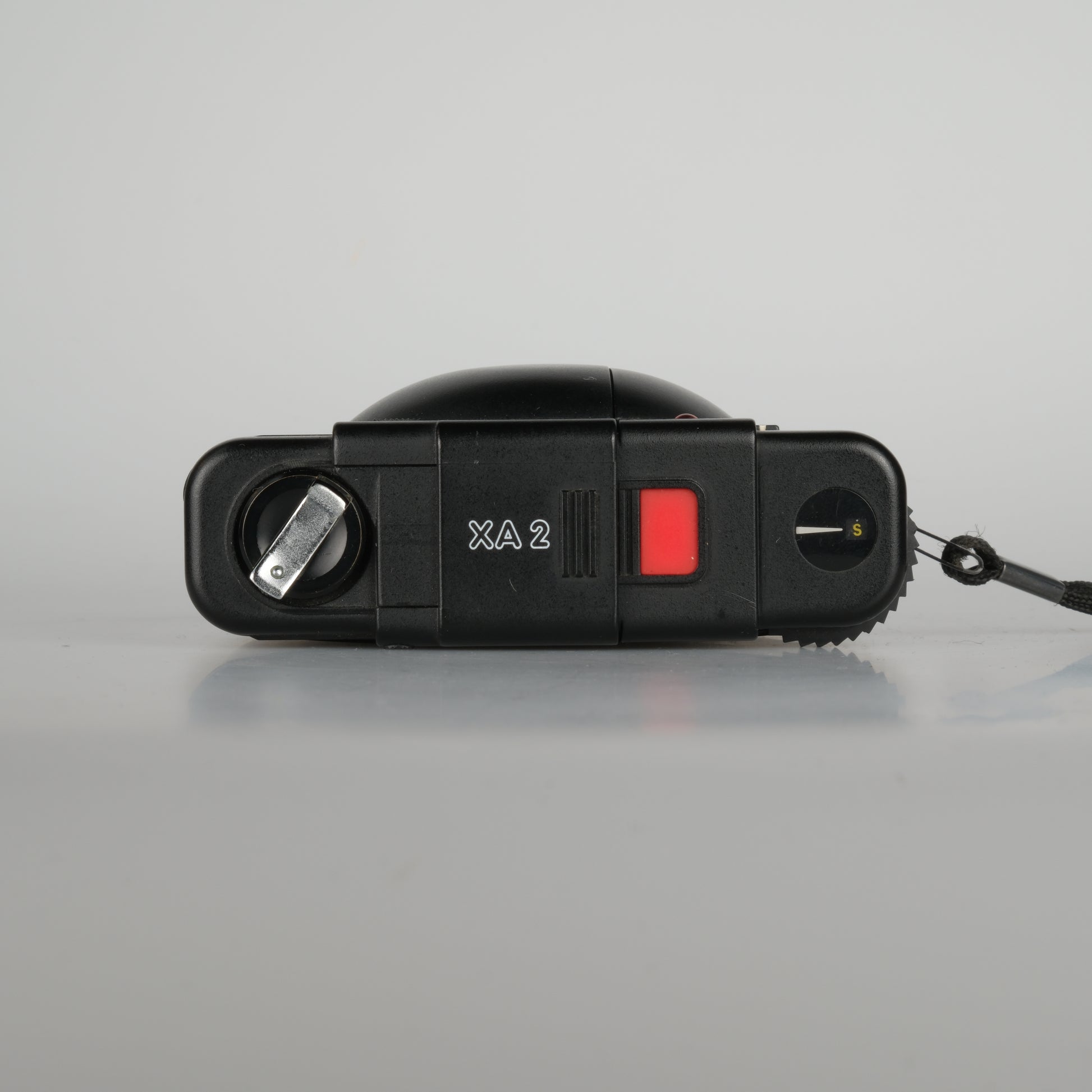 Neue Kamera mit vorderem Metallgehäuse, motorisierter Filmtransport, Focus Free Objektiv (Ab 0,6 m), abschaltbarer Blitz, Handschlaufe.