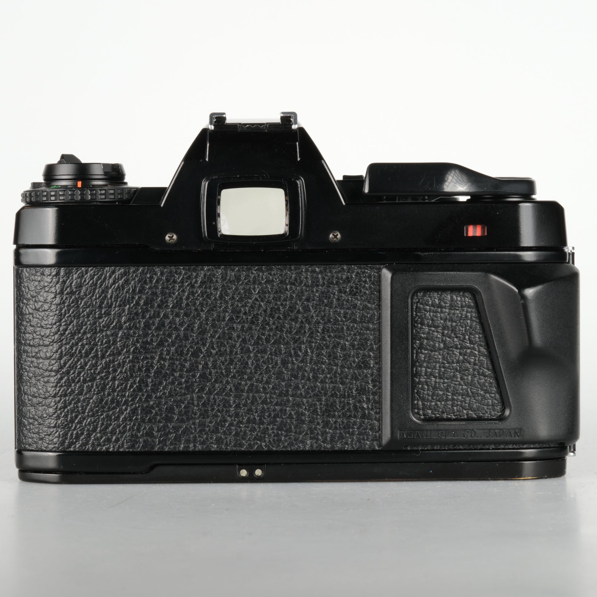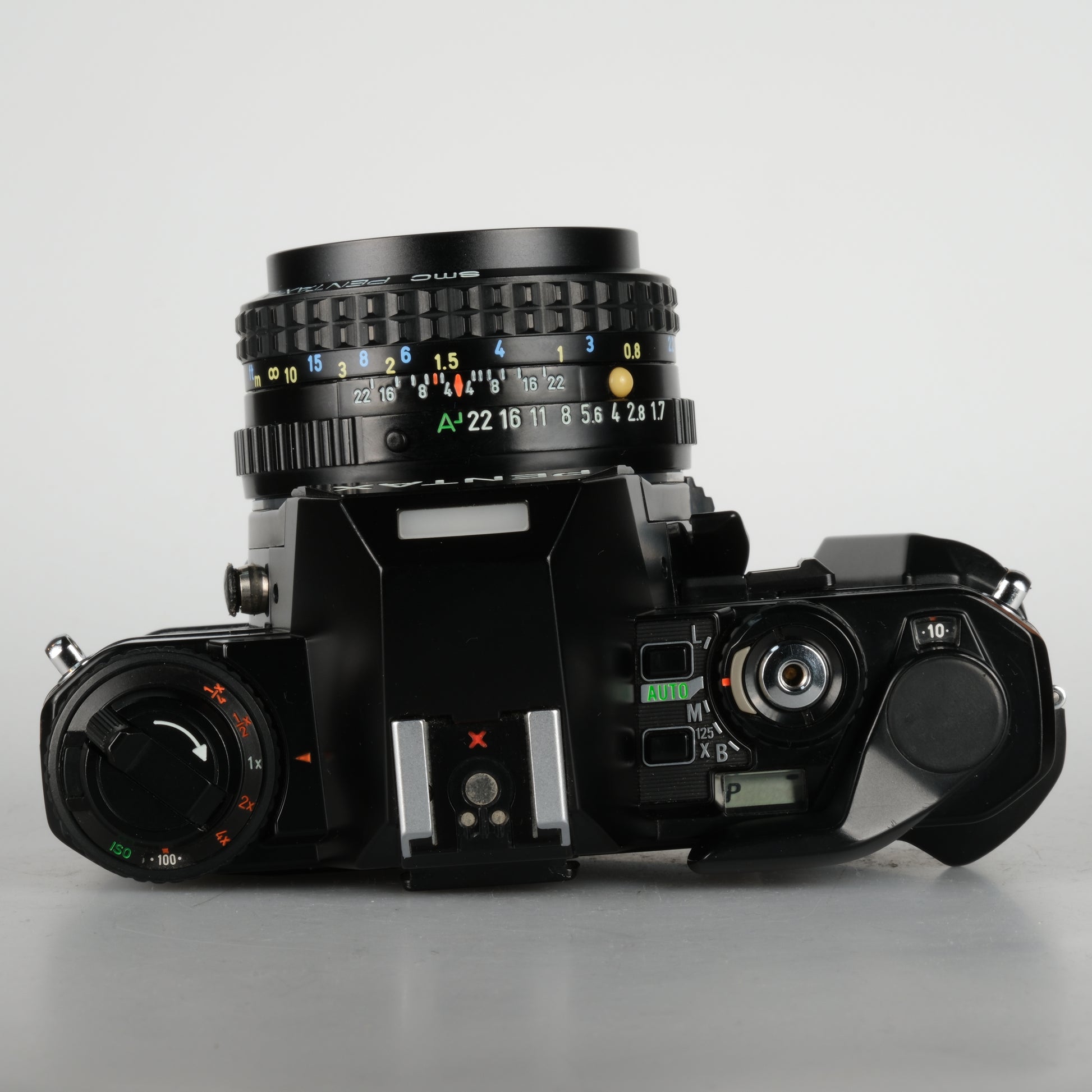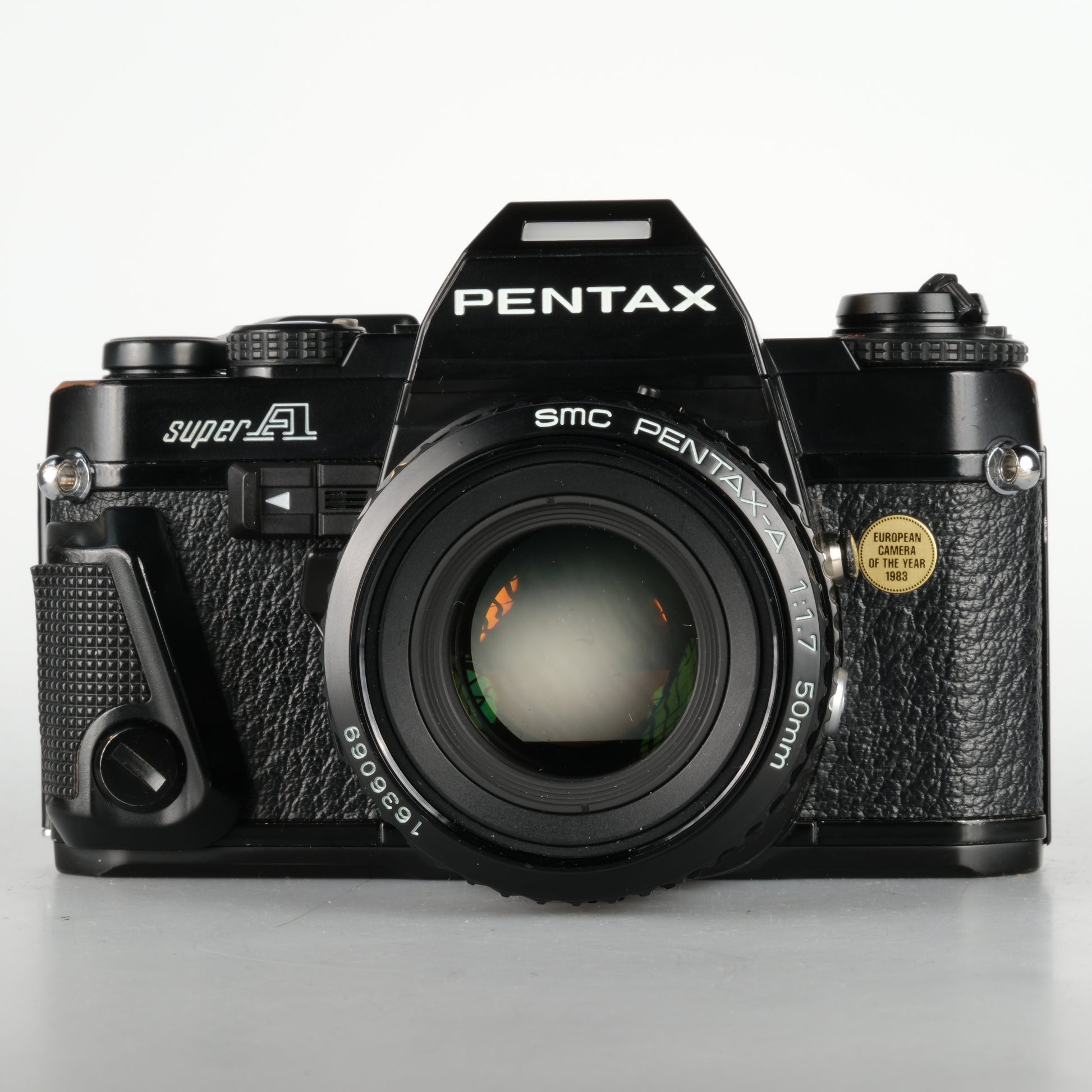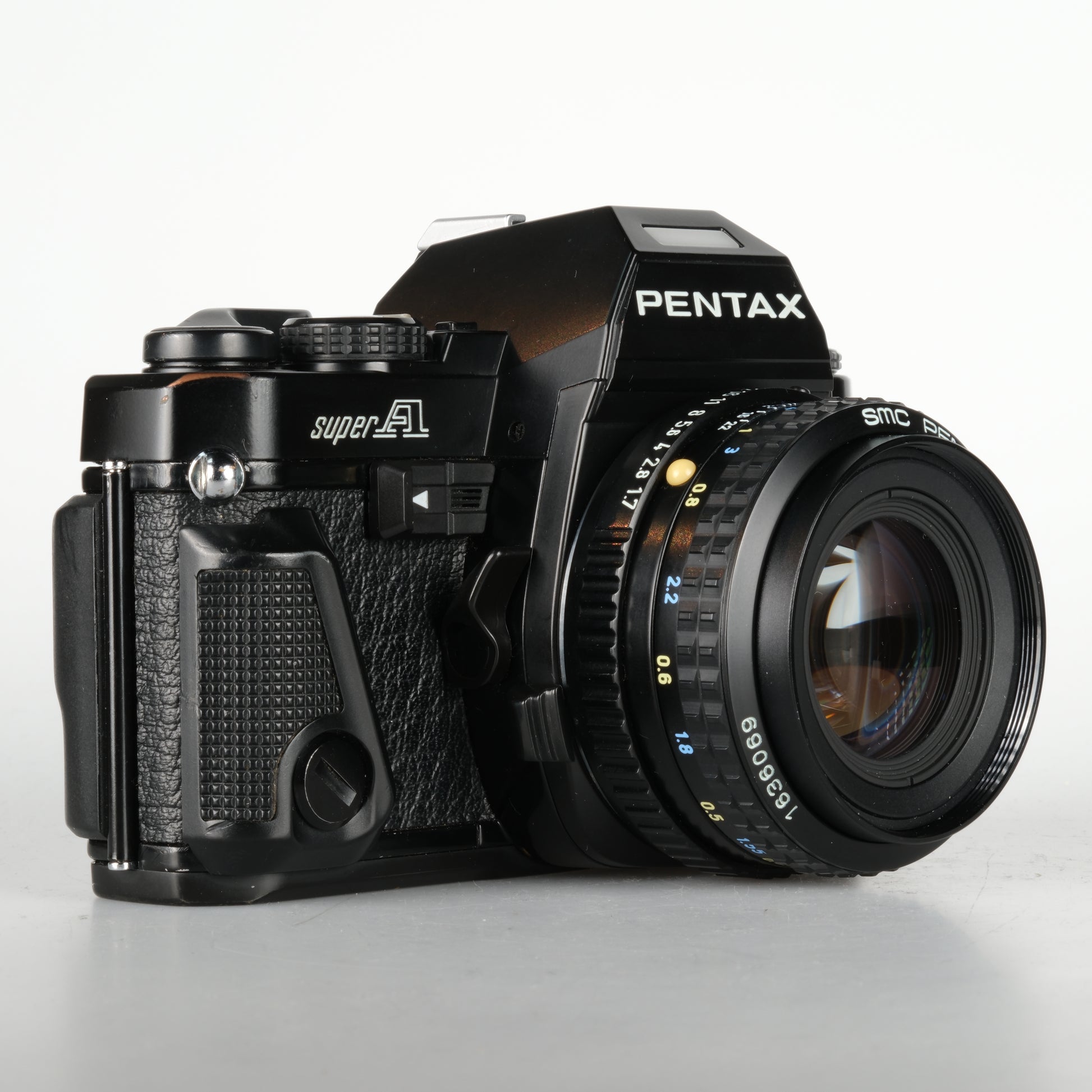 Pentax Super A 35mm Spiegelreflexkamera mit Programm-, Blenden-, Zeitautomatik und manueller Belichtung. Verschlusszeiten: 1 Sek. – 1/2000 Sek. + B. ISO über eingebauten Belichtungsmesser einstellbar (abhängig vom Film). Belichtungsmessung: TTL-Silberzelle. Kompatibel mit Pentax K‑Mount Objektiven.