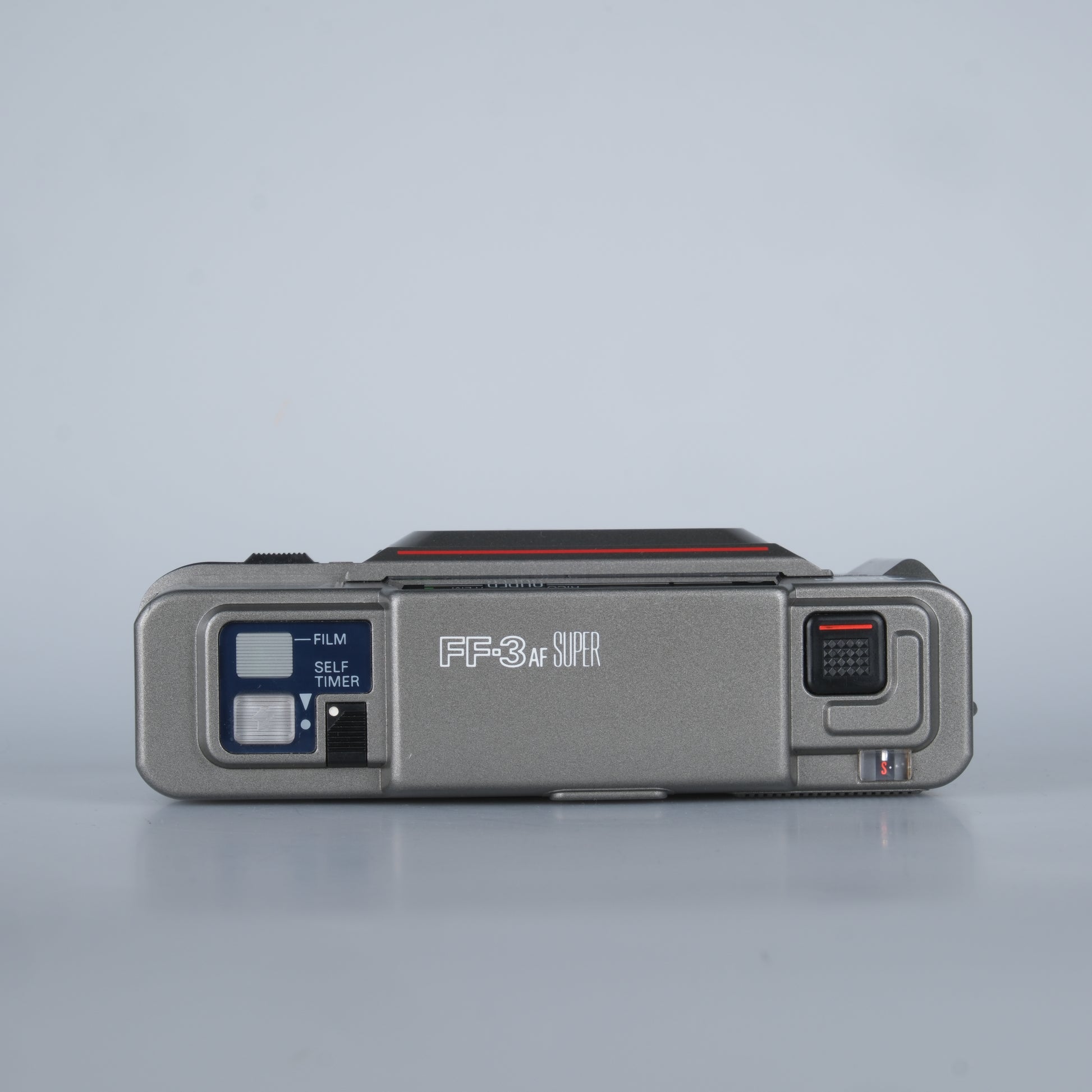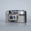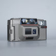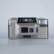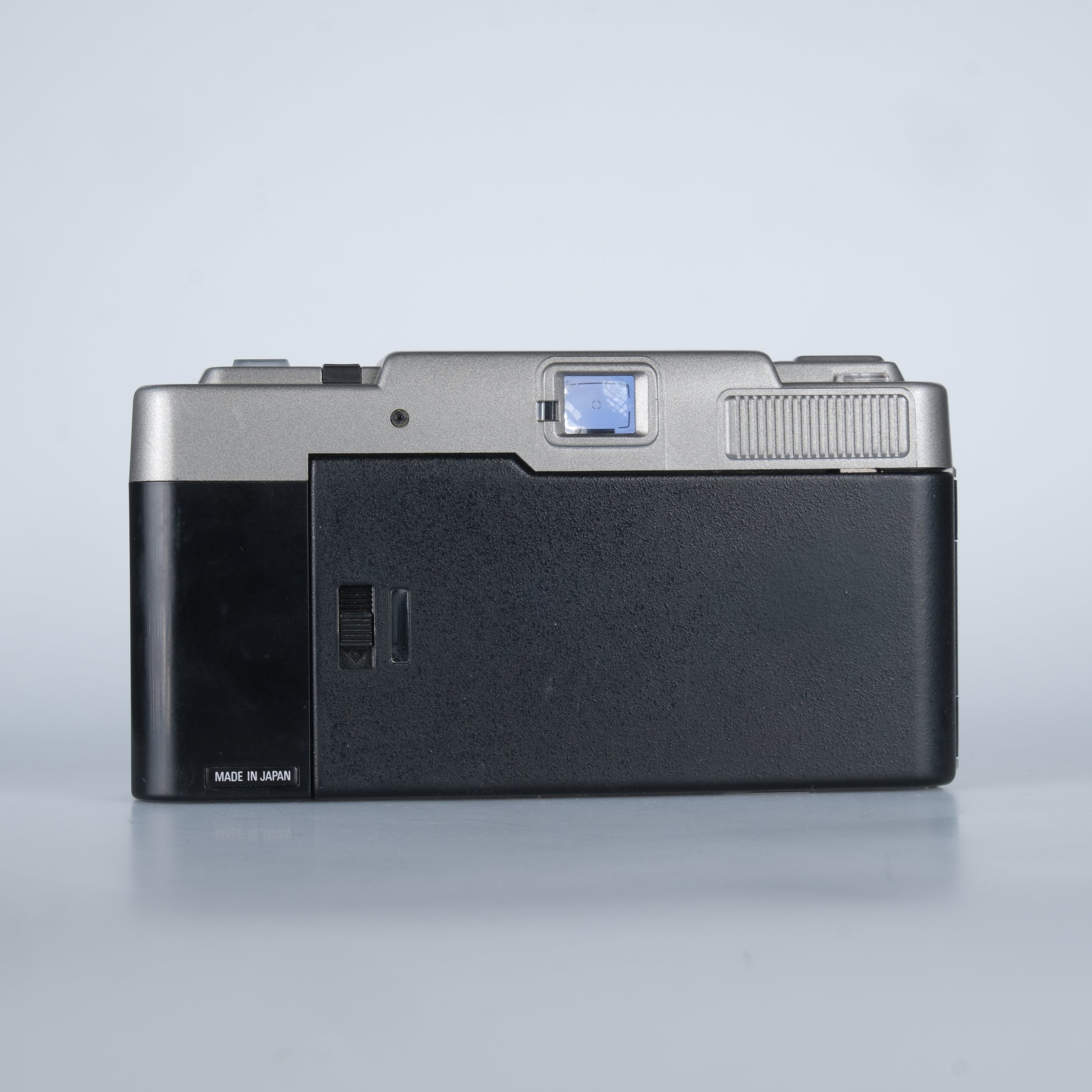 Kompakte Sucherkamera mit lichtstarkem Festbrennweitenobjektiv, manuelle Filmempfindlichkeitsangabe zwischen 25 und 1000 ISO/ASA.