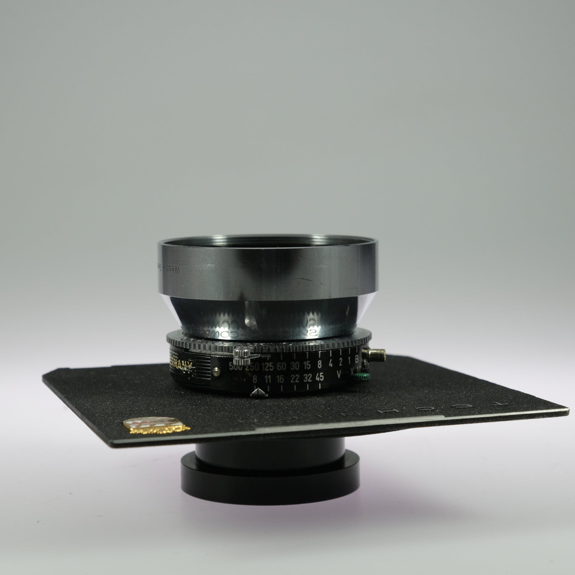 Linhof Schneider-Kreuznach 4x5 Großformatobjektiv auf Linhof Technika Objektiv Platte, Synchro-Compur Verschluss mit Verschlusszeiten 1 Sek. - 1/500 Sek. + B, Blendenbereich 8-45.